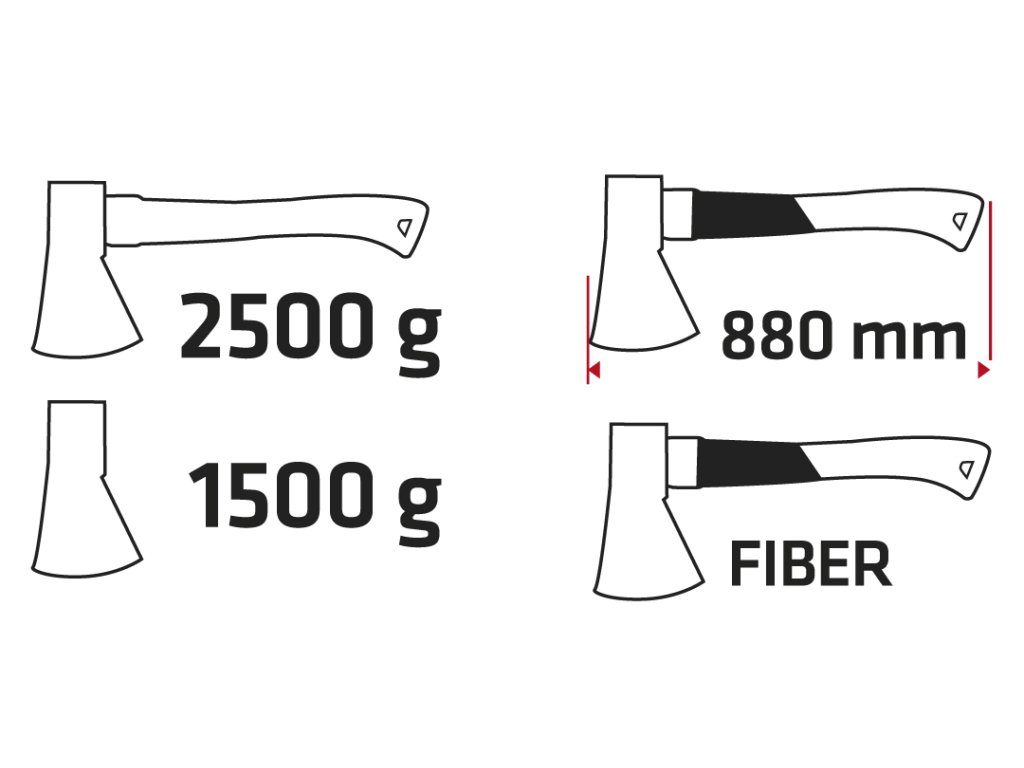 Univerzálna sekera, celková hmotnosť 2500 g, hmotnosť hlavy 1500 g, porisko zo skleného vlákna.