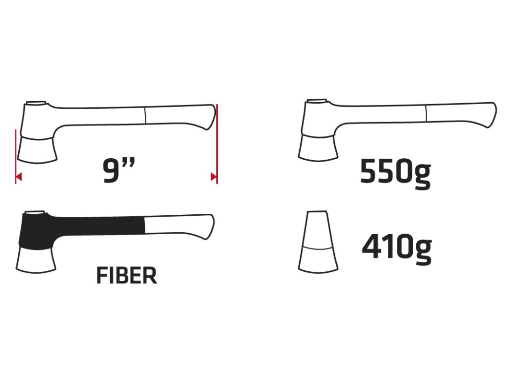 Univerzálna sekera, celková hmotnosť 550 g, hmotnosť hlavy 410 g, porisko zo skleného vlákna a TPR, hlava pokrytá teflónom, celková dĺžka 230 mm, plastový háčik.
