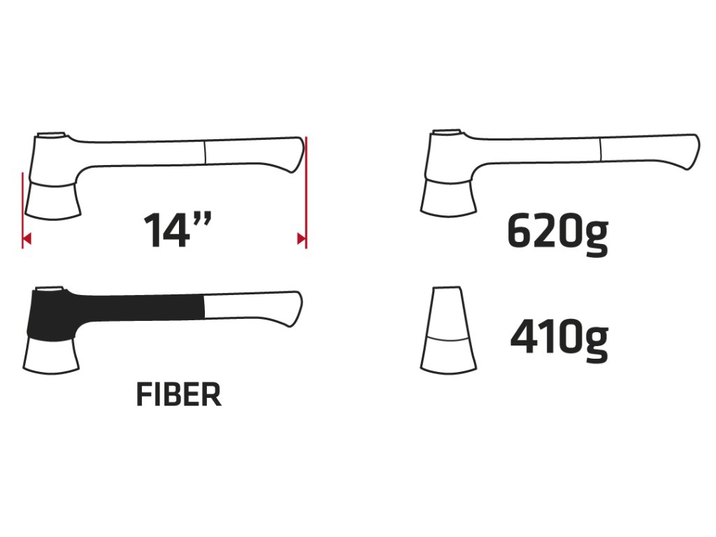 Univerzálna sekera, celková hmotnosť 620 g, hmotnosť hlavy 410 g, porisko zo skleného vlákna a TPR, hlava pokrytá teflónom, celková dĺžka 365 mm, plastový háčik.