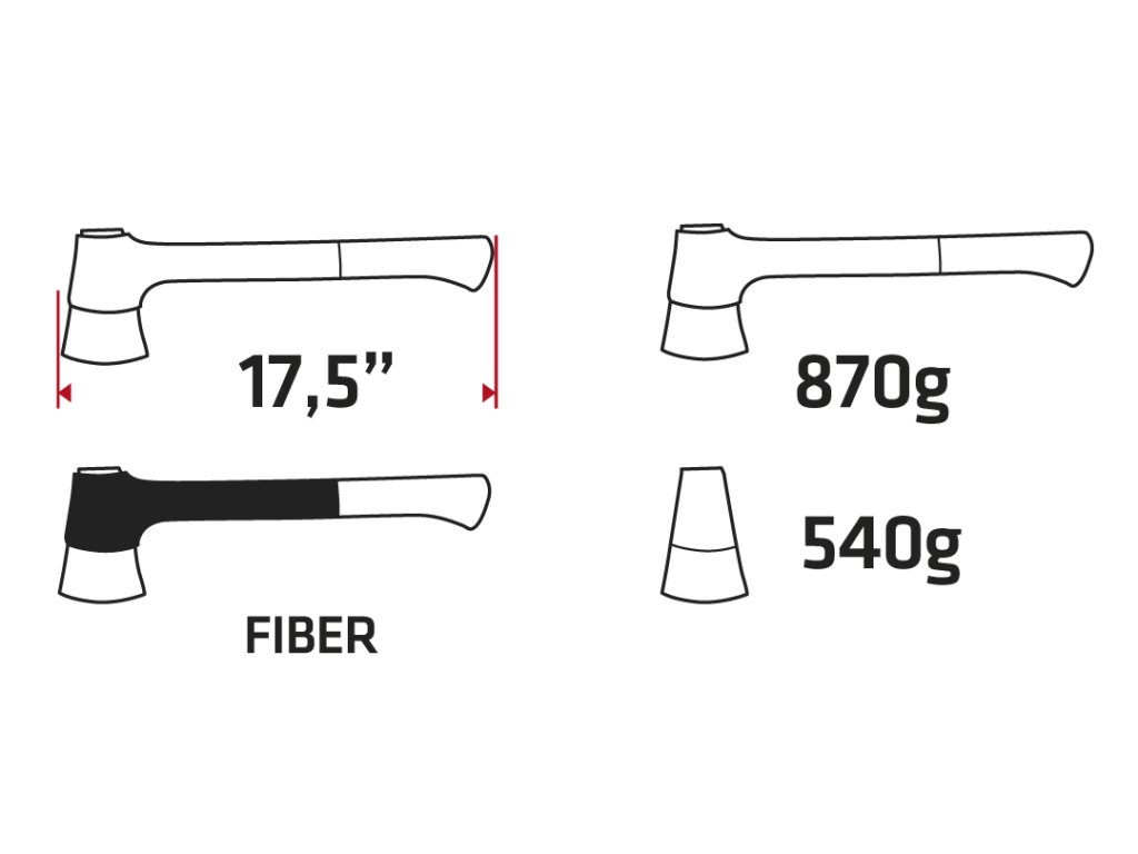 Univerzálna sekera, celková hmotnosť 870 g, hmotnosť hlavy 540 g, porisko zo skleného vlákna a TPR, hlava pokrytá teflónom, celková dĺžka 450 mm, plastový háčik.