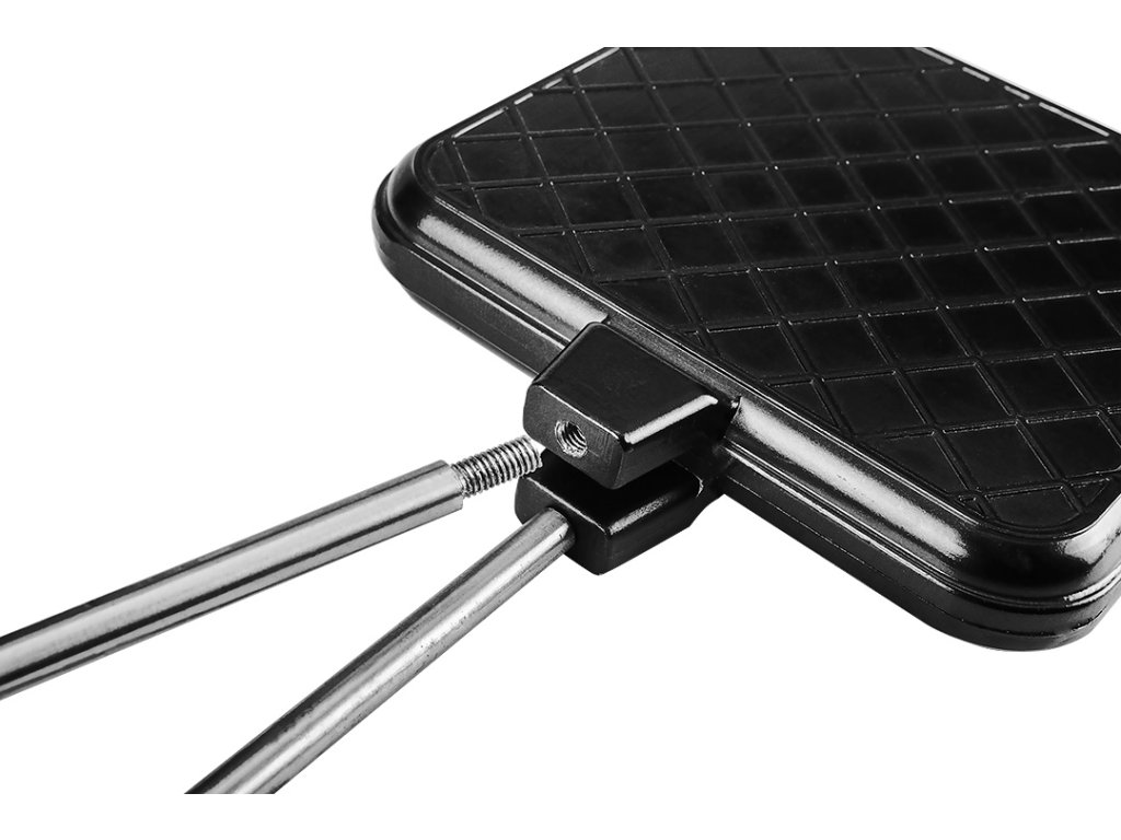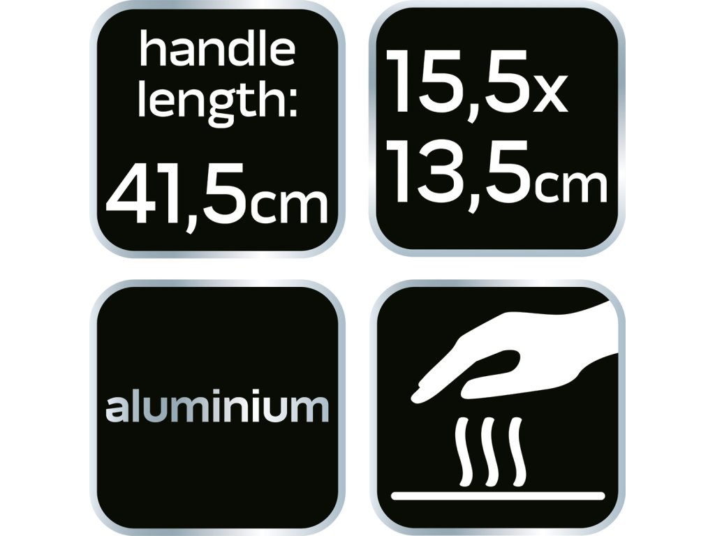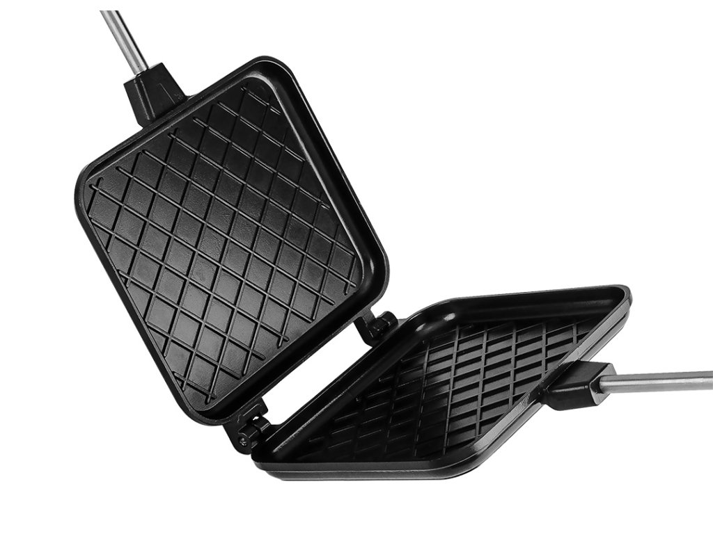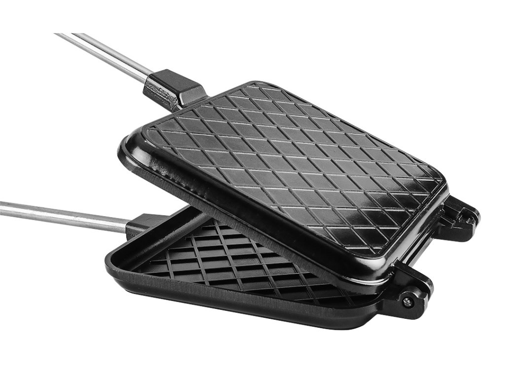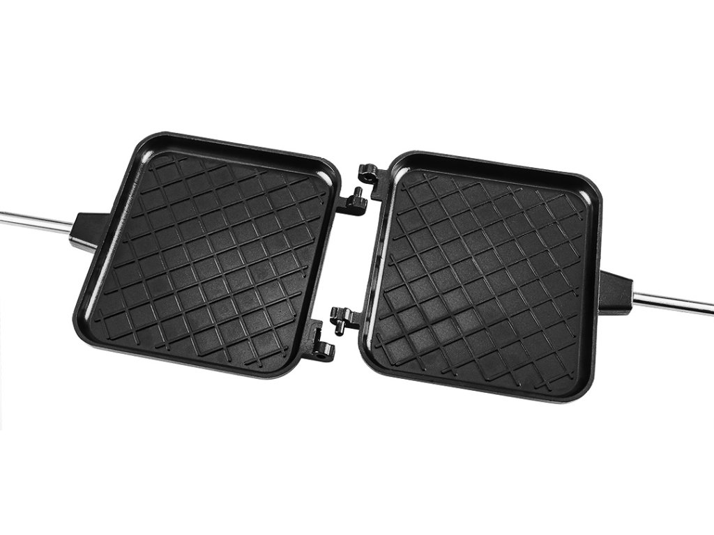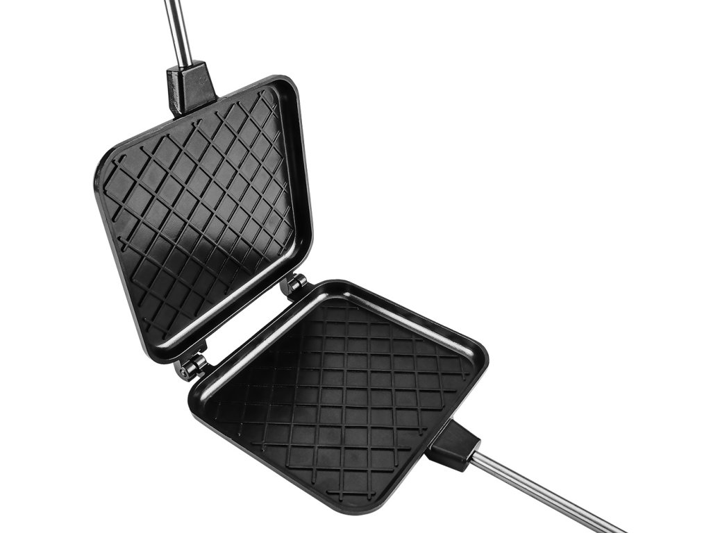 Sendvičovač na ohnisko, materiál: eloxovaná hliníková forma, pozinkovaná oceľová tyč, drevené rukoväte; veľkosť formy: Dĺžka tyče: 15,5x13,5 cm; dĺžka tyče: 15,5x13,5 cm: 41,5 cm; hmotnosť :540 g; určený na opekanie sendvičov, toastov, zeleniny a smaženie vajec na ohnisku, certifikát LFGB