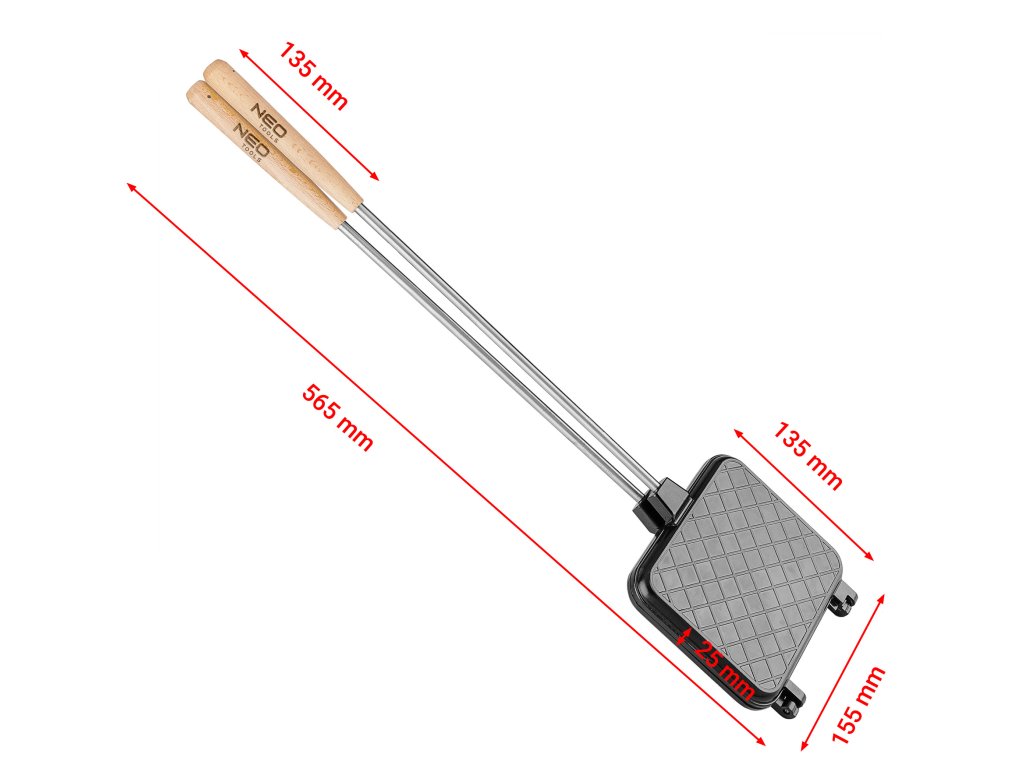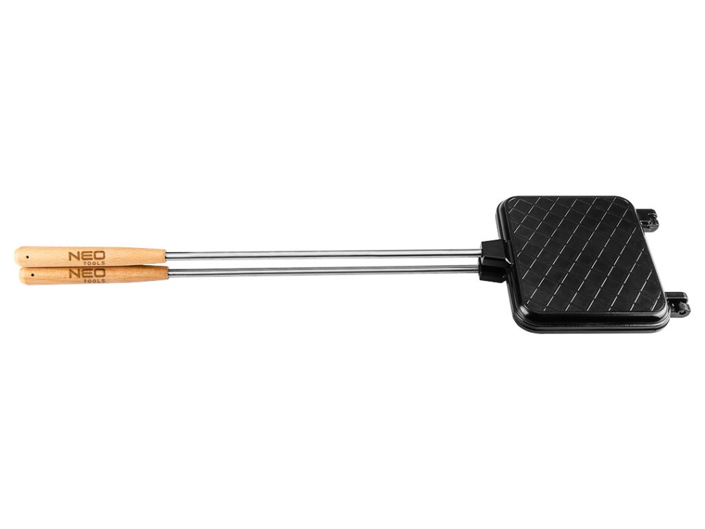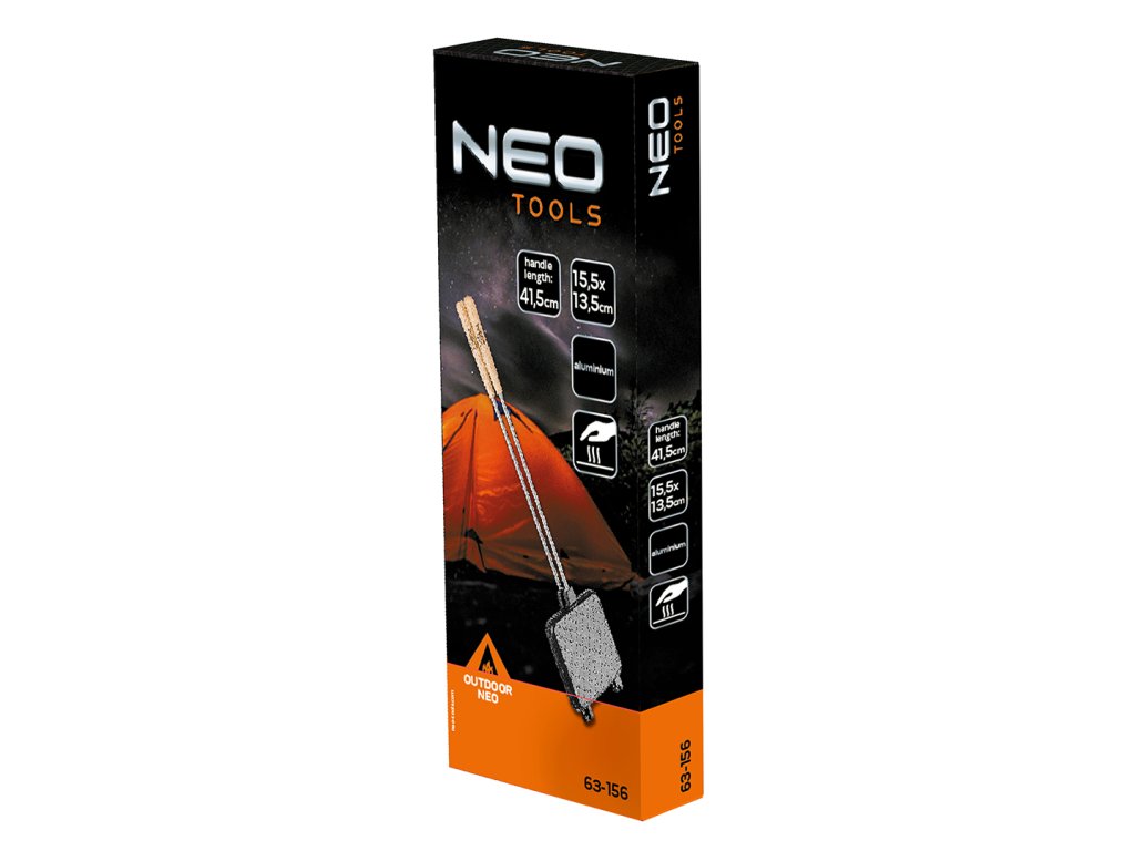 Sendvičovač 63-156 od spoločnosti NEO je výrobok vyrobený z eloxovaného hliníka (forma), pozinkovanej ocele (tyč) a drevených rukovätí. Vyznačuje sa rozmermi formy 15,5 x 13,5 cm. Hriankovač sa odporúča na prípravu sendvičov, opekanie a smaženie vajec na ohnisku. Dĺžka tyče je 41,5 cm a poskytuje dostatočnú vzdialenosť od ohňa. Hmotnosť hriankovača je len 540 g. Výrobok značky NEO je vhodný na kempovanie a výlety.