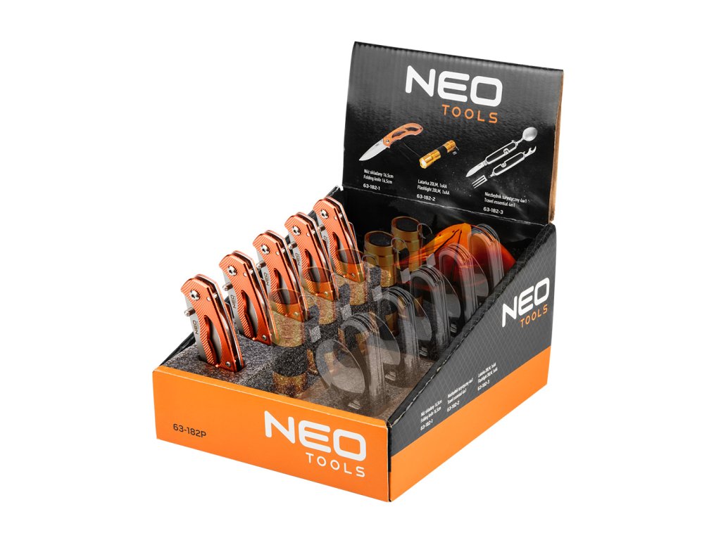 Skladací nôž s dĺžkou 16,5 cm, 63-182-1 od spoločnosti NEO TOOLS je súprava 5 viacúčelových nástrojov, ktoré je dobré mať vždy po ruke. Model skladacieho noža z robustnej nehrdzavejúcej ocele 3Cr13 je tou správnou voľbou na rôzne projekty. Rovnako dobre poslúži na domáce použitie, v dielni alebo na výprave za prežitím. Celková dĺžka nástroja je 165 mm, pričom dĺžka čepele je 65 mm. Skladací nôž NEO TOOLS má zabudovaný klip na opasok a bezpečnostnú poistku, ktorá zabraňuje neočakávanému zatvoreniu.