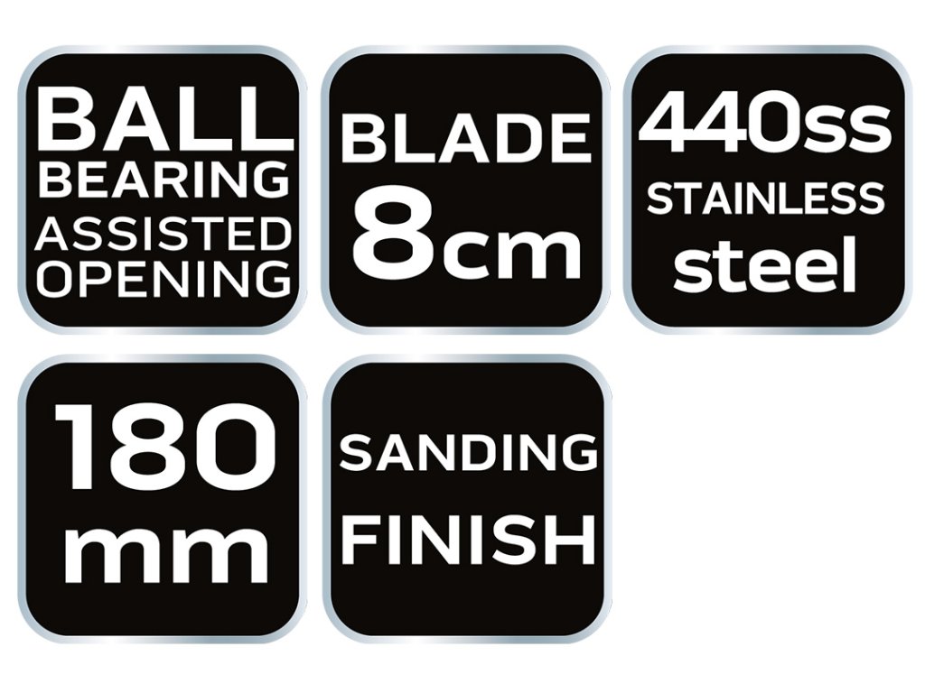 Skladací nôž z nehrdzavejúcej ocele s dĺžkou 17,5 cm a čepeľou 8 cm. Nožík je vybavený sponou na opasok.