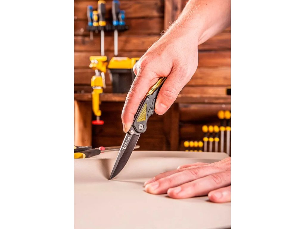 Rukoväť je ergonomická, potiahnutá odolným nylónom a perfektne padne do ruky, zároveň zabezpečí silný a bezpečný úchop. Možnosť zloženia uľahčuje jeho skladovanie a znižuje riziko mimovoľného porezania sa. Poistka zabraňuje nečakanému otvoreniu noža.