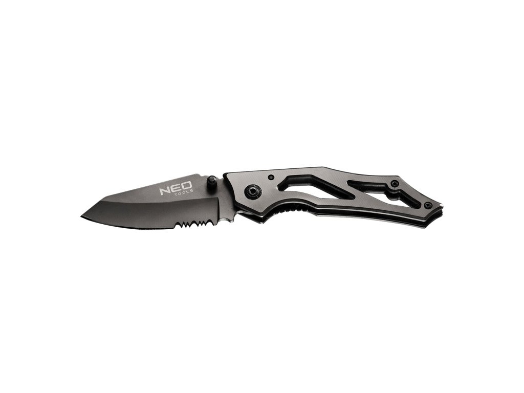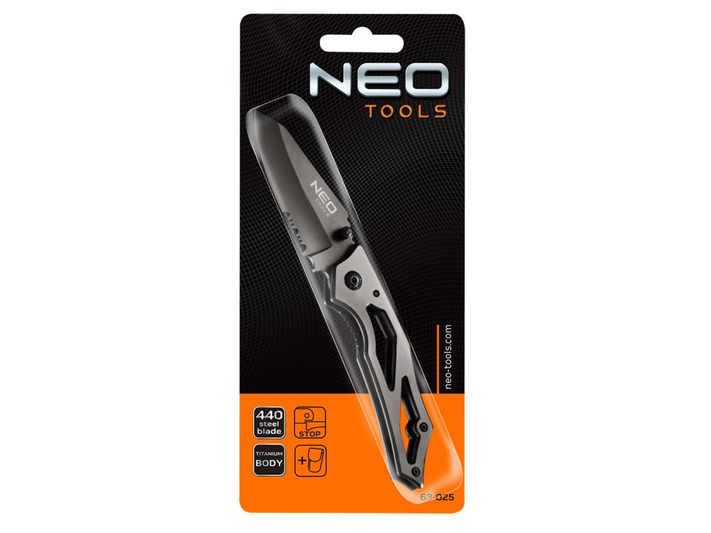 Sklápací nôž NEO so zámkom (ref. 63-025) má čepeľ vyrobenú z ocele 440, dlhú 7 cm. Titánové puzdro zaručuje dlhú životnosť nástroja. Zámok proti neočakávanému zatvoreniu zaisťuje bezpečnosť počas práce. Puzdro z odolného nylonu uľahčuje skladovanie a prepravu. Značka NEO spĺňa očakávania profesionálov.