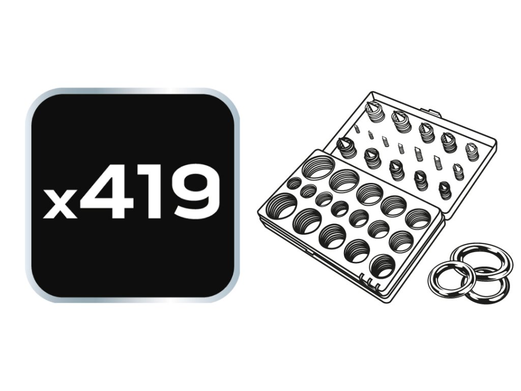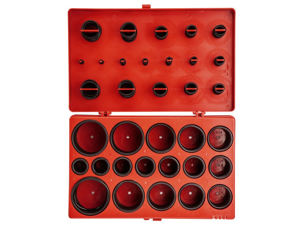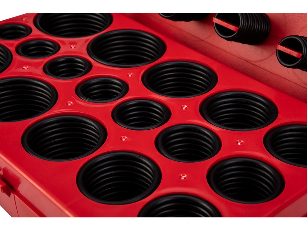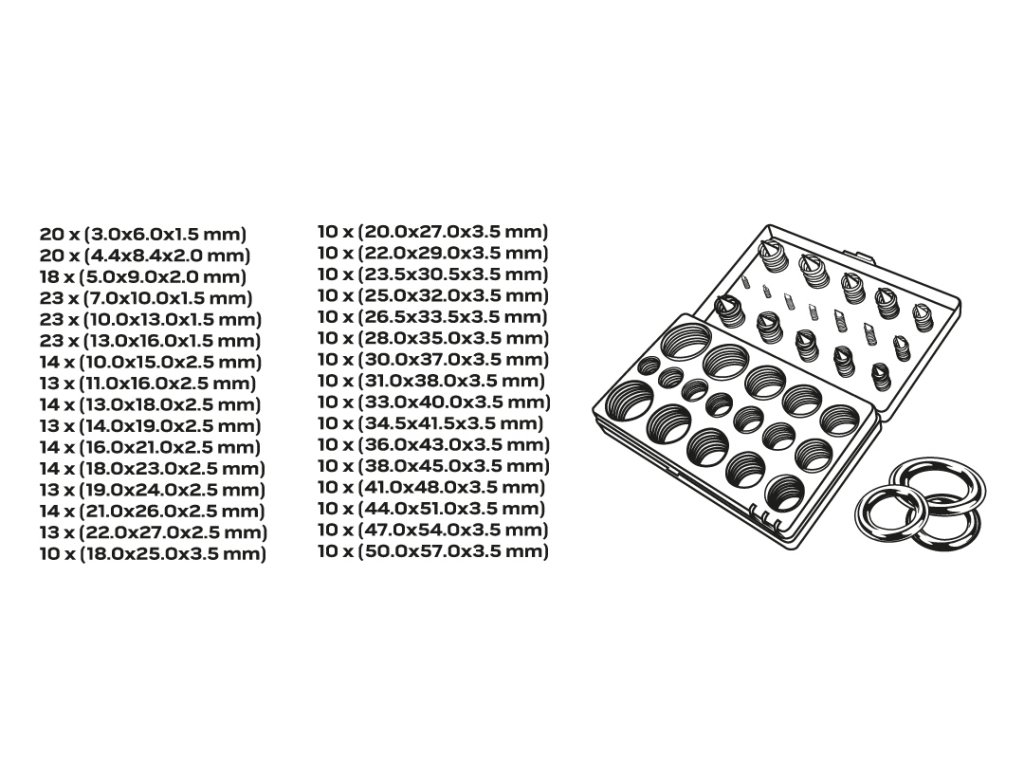 Gumové O-krúžky: 20 x (3x6x1.5 mm), 20 x (4,4x8,4x2 mm), 18 x (5x9x2 mm), 23 x (7x10x1,5 mm), 23 x (10x13x1,5 mm), 23 x (13x16x1,5 mm), 14 x (10x15x2,5 mm), 13 x (11x16x2,5 mm), 14 x (13x18x2,5 mm), 13 x (14x19x2.5 mm), 14 x (16x21x2,5 mm), 14 x (18x23x2,5 mm), 13 x (19x24x2,5 mm), 14 x (21x26x2,5 mm), 13 x (22x27x2,5 mm), 10 x (18x25x3,5 mm), 10 x (20x27x3,5 mm), 10 x (22x29x3.5 mm), 10 x (23,5x30,5x3,5 mm), 10 x (25x32x3,5 mm), 10 x (26,5x33,5x3,5 mm), 10 x (28x35x3,5 mm), 10 x (30x37x3,5 mm), 10 x (31x38x3,5 mm), 10 x (33x40x3,5 mm), 10 x (34,5x41.5x3,5 mm), 10 x (36x43x3,5 mm), 10 x (38x45x3,5 mm), 10 x (41x48x3,5 mm), 10 x (44x51x3,5 mm), 10 x (47x54x3,5 mm), 10 x (50x57x3,5 mm)