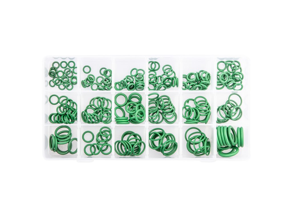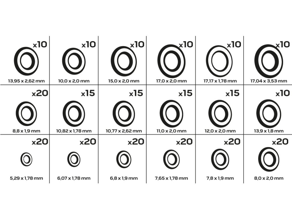 HNBR A/C O-krúžky: 20 x (5.29 x 1,78 mm), 20 x (6,07 x 1,78 mm), 20 x (6,8 x 1,9 mm), 20 x (7,65 x 1,78 mm), 20 x (7,8 x 1,9 mm), 20 x (8 x 2 mm), 20 x (8,8 x 1,9 mm), 15 x (10,82 x 1,78 mm), 15 x (10,77 x 2.62 mm), 15 x (11 x 2 mm), 15 x (12 x 2 mm), 10 x (13,9 x 1,8 mm), 10 x (13,95 x 2,62 mm), 10 x (10 x 2 mm), 10 x (15 x 2 mm), 10 x (17 x 2 mm), 10 x (17,17 x 1,78 mm), 10 x (17,04 x 3.53 mm)