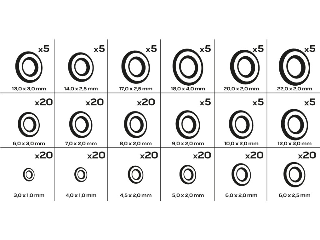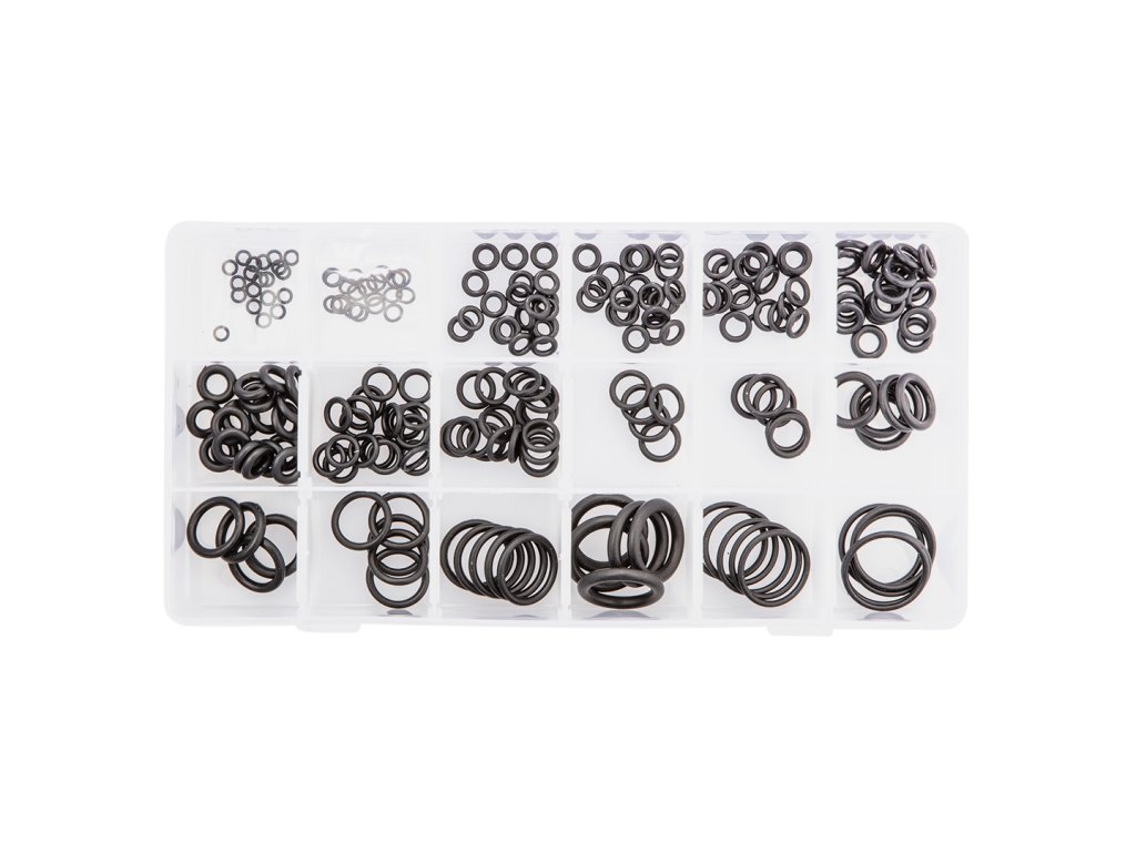 O-krúžky NBR:20 x (3 x 1 mm), 20 x (4 x 1 mm), 20 x (4,5 x 2 mm), 20 x (5 x 2 mm), 20 x (6 x 2 mm), 20 x (6 x 2 mm), 20 x (6 x 2.5 mm), 20 x (6 x 3 mm), 20 x (7 x 2 mm), 20 x (8 x 2 mm), 5 x (9 x 2 mm), 5 x (10 x 2 mm), 5 x (12 x 3 mm), 5 x (13 x 3 mm), 5 x (14 x 2,5 mm), 5 x (17 x 2,5 mm), 5 x (18 x 4 mm), 5 x (20 x 2 mm), 5 x (22 x 2 mm)
