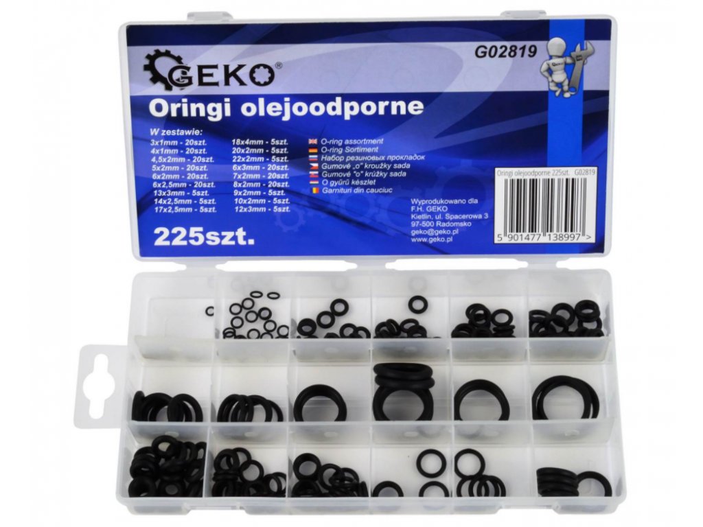 Sada tesniacich o-krúžkov 225ks. Tesnenia sú odolné voči oderu, korózii, vysokej teplote, vysokému tlaku, kyselinám, benzínu a oleju. Celá sada je umiestnená v plastovom boxe s priehradkami.