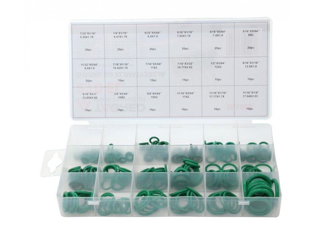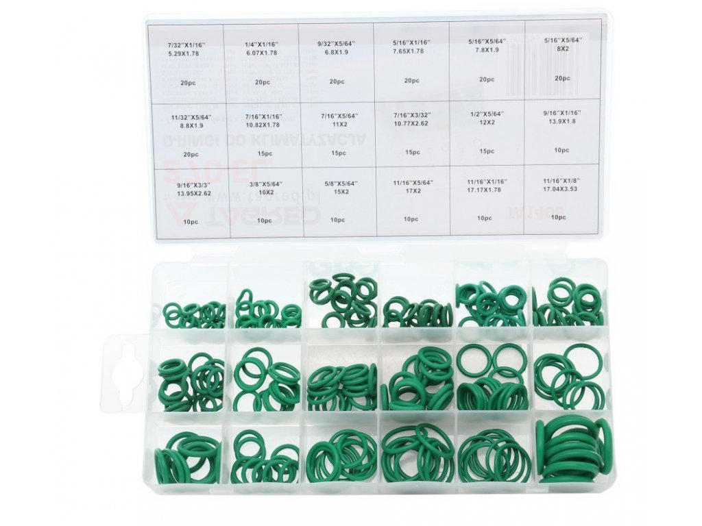 Sada veľmi odolných O-krúžkov pre klimatizáciu odolných voči: ozónu, motorovej nafte, minerálnym olejom a mastnote, olejom rastlinného a živočíšneho pôvodu, ľahkým vykurovacím olejom, emulziám olej-voda typu hsa, hsb, alifatickým sacharidom ako: benzín , propán-bután, zriedené kyseliny, zásady a soli (aj pri zvýšených teplotách), kyslé plyny. Kvapaliny typu glykol-voda do 150 °C.