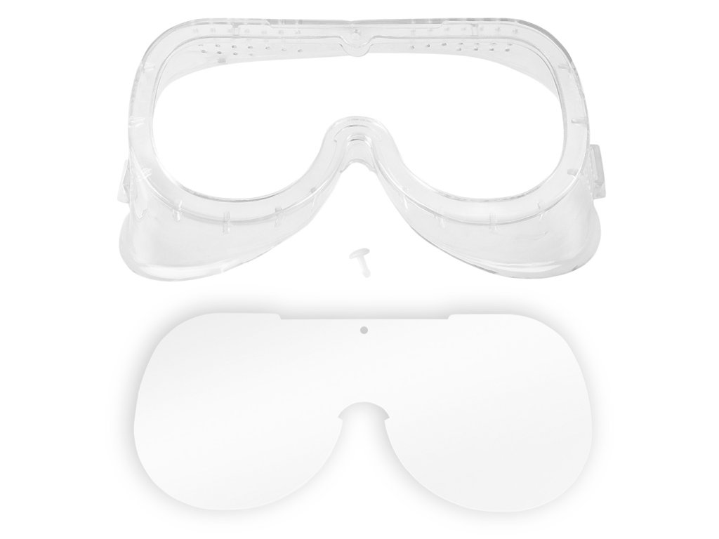 Ochranné okuliare, biele, trieda odolnosti B (odolnosť voči nárazom vysokorýchlostných častíc (do 120 m/s) so strednou energiou nárazu), trieda optiky 1 - nepretržité používanie, číre polykarbonátové ochranné okuliare, gumový nástavec na okuliare, certifikácia CE