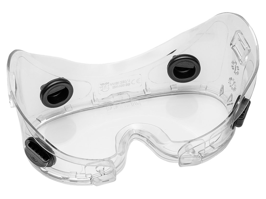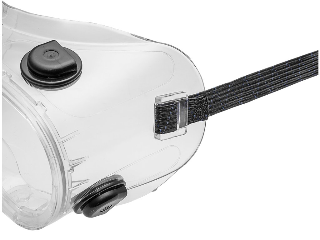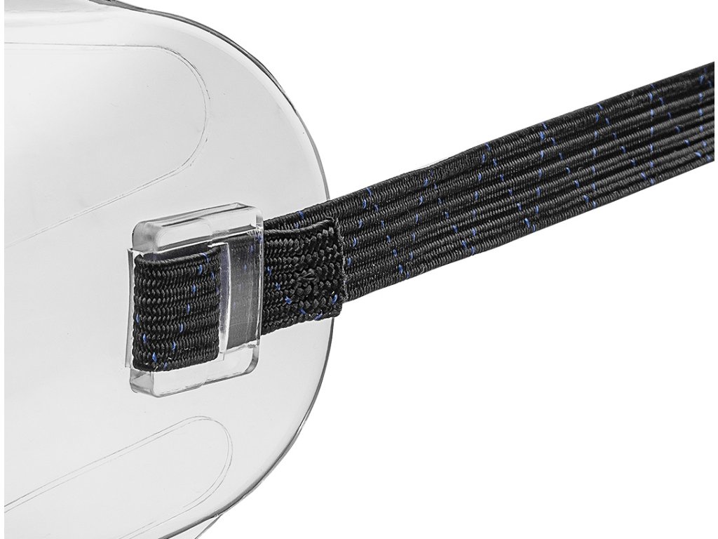 ochranné okuliare, trieda odolnosti B (odolnosť voči nárazom vysokorýchlostných častíc (do 120 m/s) so strednou energiou nárazu), číre polykarbonátové ochranné okuliare, gumový nástavec na okuliare, certifikácia CE