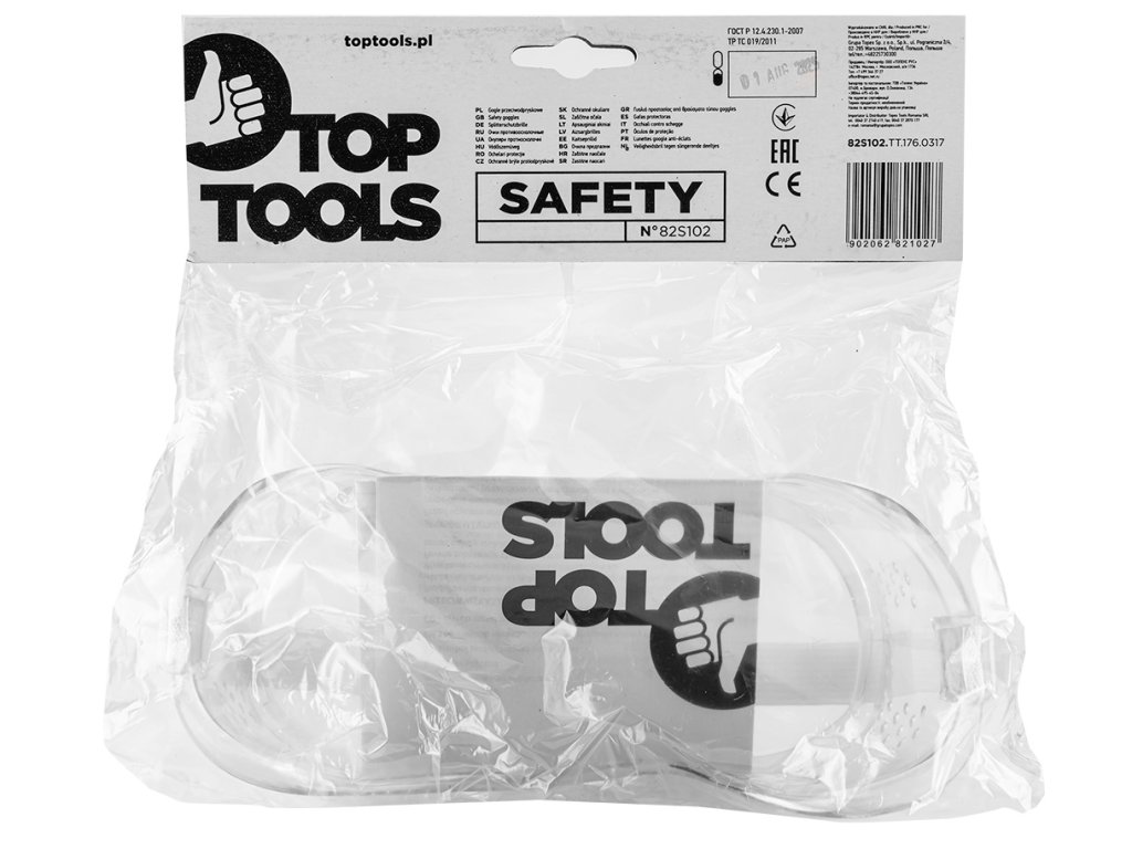Ochranné okuliare Top Tools (ref. 82S102) sa používajú na ochranu očí pred úlomkami pevných látok. Sú navrhnuté tak, aby zabezpečili osobnú bezpečnosť používateľa. Používajú sa v prostredí, kde existuje riziko vniknutia jemných častíc pevných látok do očí, pri kovaní, brúsení, rezaní atď.