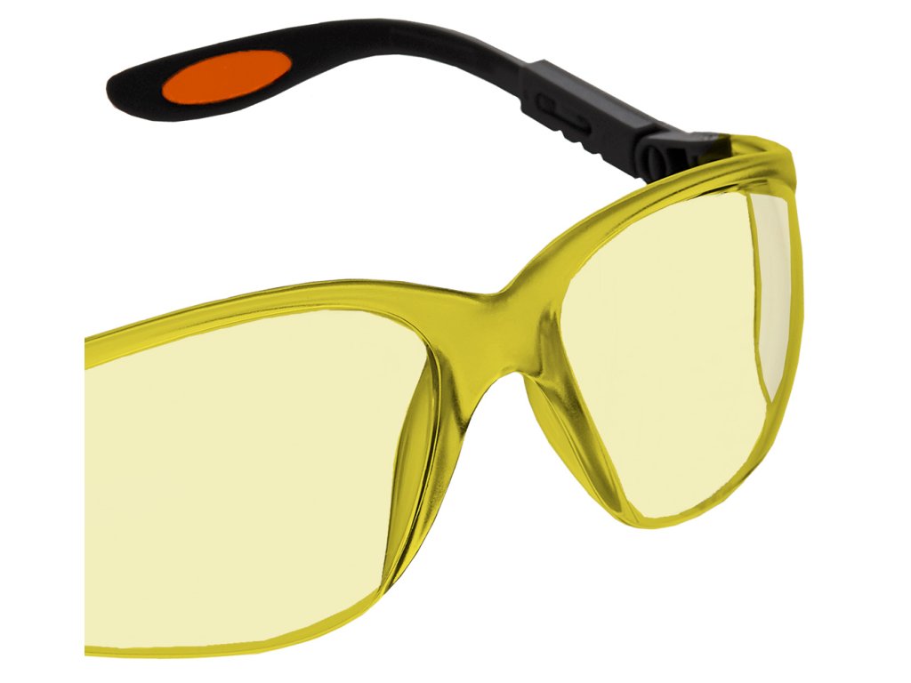 Ochranné okuliare, polykarbonát, žlté šošovky, nylonové ramienka, nastavenie dĺžky a uhla spánkov, gumová koncovka, odolné proti poškriabaniu, CE