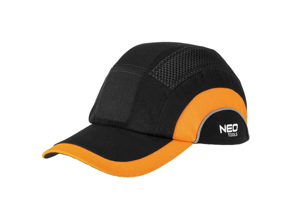 Vystužená baseballová čiapka, čierno-oranžová, CE 97-592 od značky NEO TOOLS je vystužená čiapka vyrobená zo 75 % bavlny a 25 % polyesteru (vonkajšia časť) a ABS (plášť čiapky). Výrobok je charakteristický svojou čiernou a oranžovou praktickou farbou. Je vybavená vetracími vložkami zo sieťoviny, ktoré umožňujú ľahkú termoreguláciu. Možno ju prispôsobiť obvodu hlavy vďaka suchému zipsu, ktorým sa čiapka prispôsobí veľkosti od 55 do 66 cm. Odnímateľná škrupina uľahčuje starostlivosť o hygienu a certifikát CE potvrdzuje súlad s európskymi normami. Reflexné prvky sa hodia po zotmení a v zle osvetlených oblastiach. Vystužená bejzbalová čiapka značky NEO TOOLS sa odporúča na prácu v sklade, kde je nad pracovníkom druhé poschodie s károvanou podlahou.