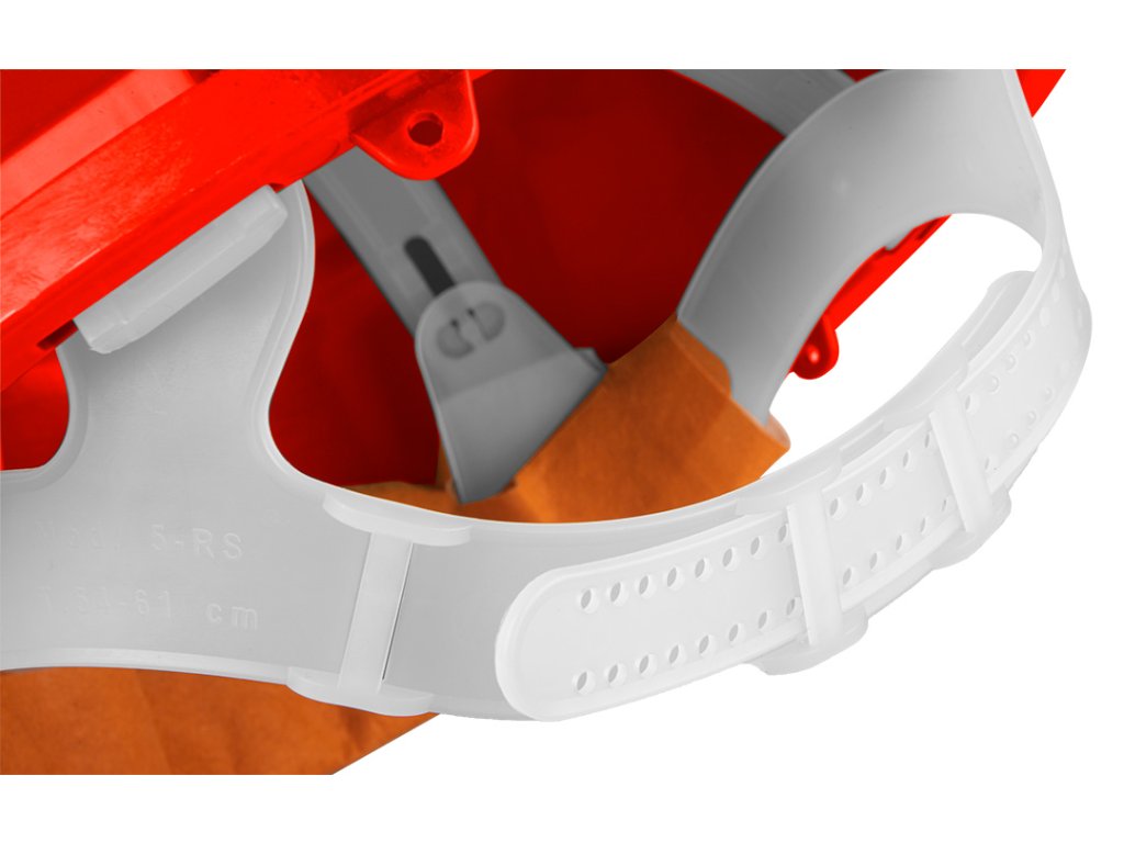Certifikovaná ochranná prilba, červená, vyrobená z HDPE materiálu. Nastaviteľný obvod hlavného pásu od 54 do 61 cm, čo umožňuje prilbu prispôsobiť sa hlave.
