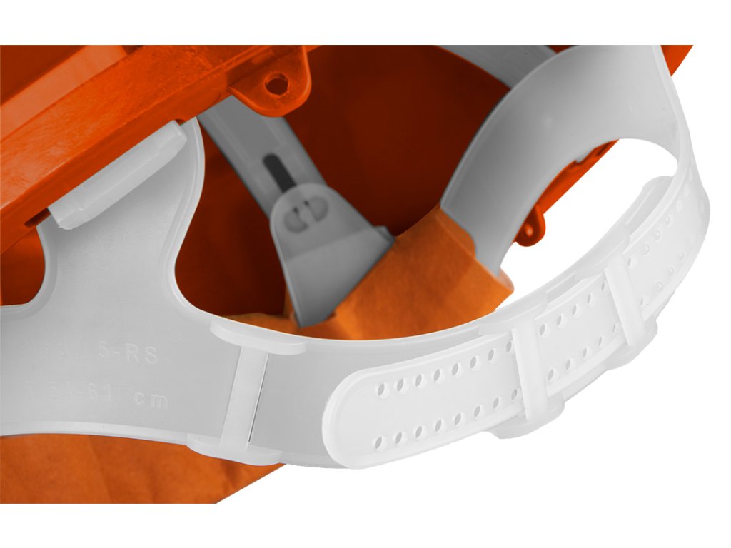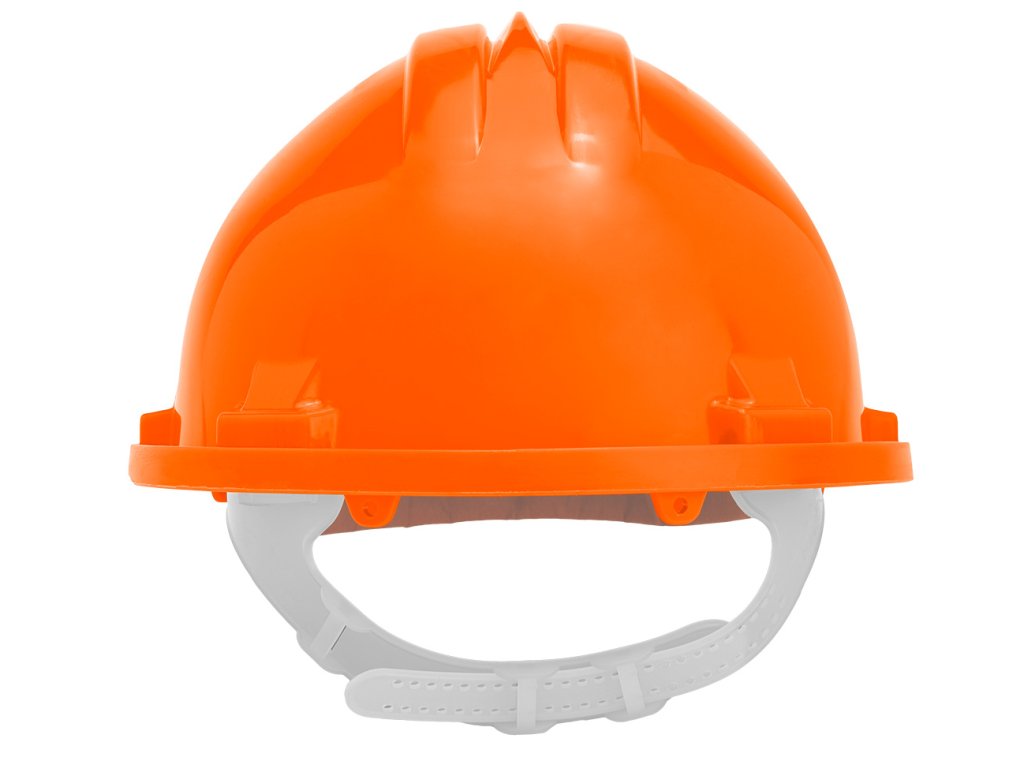 Certifikovaná ochranná prilba, oranžová, vyrobená z HDPE materiálu. Nastaviteľný obvod hlavného pásu od 54 do 61 cm, čo umožňuje prilbu prispôsobiť sa hlave.