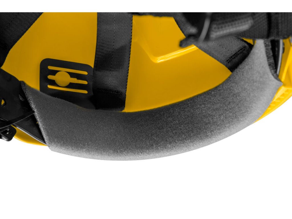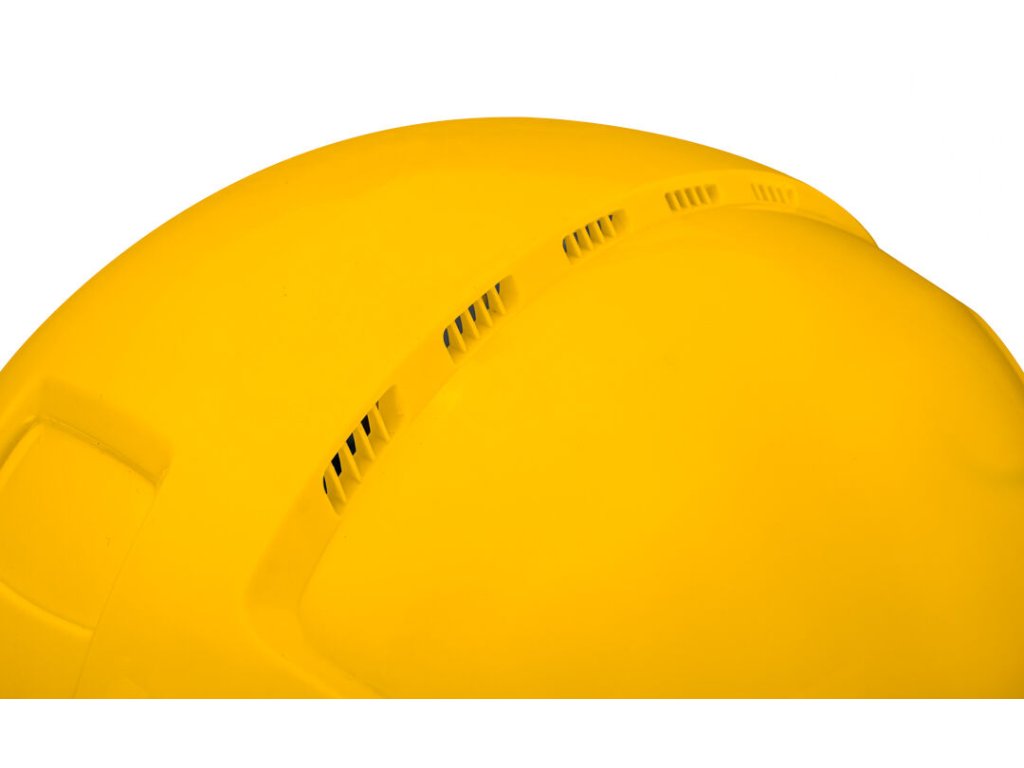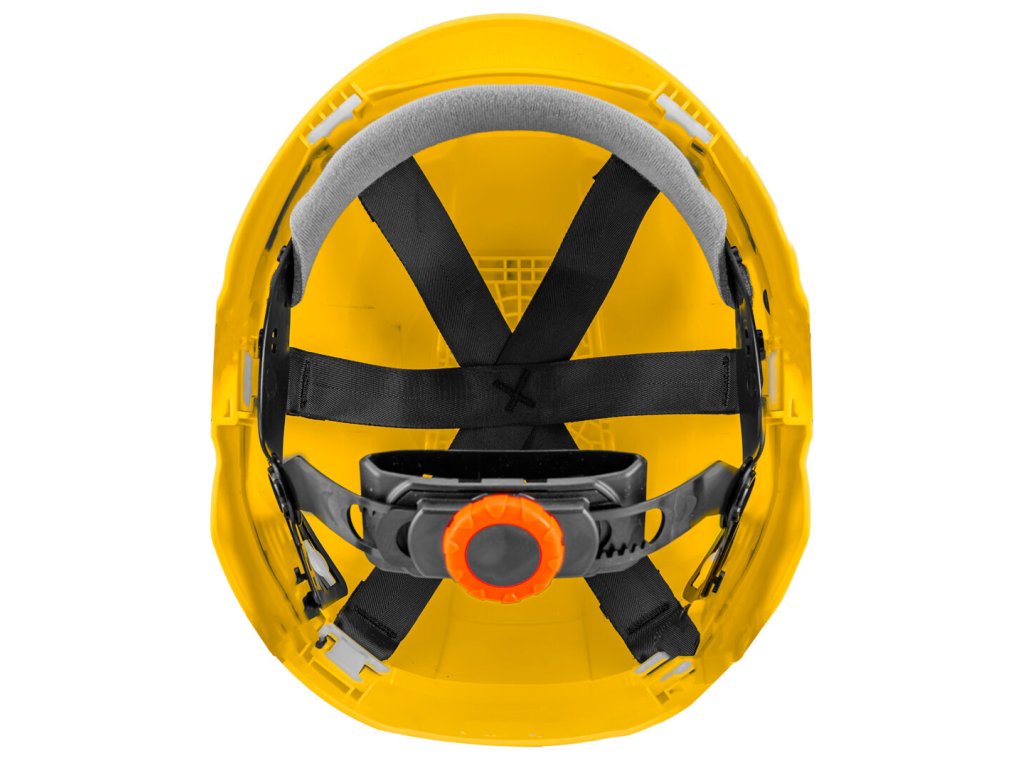Priemyselná prilba na prácu vo výškach, žltá, nastaviteľný obvod 51-63 cm, materiál: ABS, 6-bodový popruh, 4-bodový remienok pod bradou, hmotnosť: 430 g, chráni pred nárazom predmetov, ako sú kamene, dlaždice, tehly a iné podobné predmety, možno ju používať v teplotnom rozsahu -30°C/+50°C, odolná voči bočnej deformácii (LD), automatické nastavenie obvodu pomocou gombíka, má vetracie otvory, potný pásik súčasťou balenia, certifikát CE