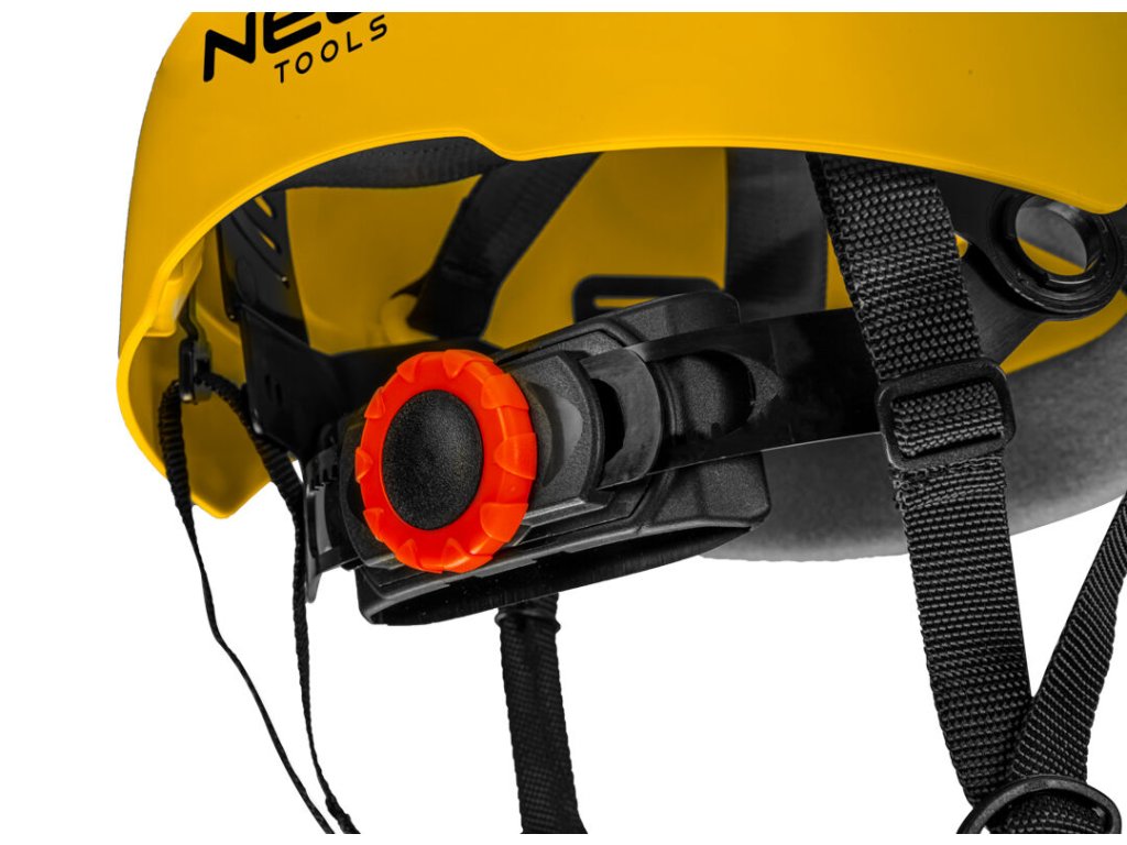 Priemyselná prilba na prácu vo výškach, žltá 97-210 od spoločnosti NEO je prilba v žltej farbe určená pre manuálnych pracovníkov. Výrobok s nízkou hmotnosťou 430 g a poľskou výrobou ponúka vysokú odolnosť pri prácach vo výškach. Je vyrobená z odolného plastu ABS a obsahuje 10 ventilačných otvorov, ktoré umožňujú voľné prúdenie vzduchu vo vnútri prilby. Prilba sa skladá z otočného postroja, pevnej škrupiny prilby a súpravy popruhov (bradový popruh pripevnený v 4 bodoch), nosného popruhu (pripevnený k škrupine v 6 bodoch) a popruhu s pohodlným nastavovacím mechanizmom, ktorý umožňuje meniť parametre pomocou ľahko ovládateľného gombíka. Prilba má aj velúrovú vymeniteľnú potnú vložku. Výrobok má široký rozsah nastavenia (od 51 do 63 cm). Môže sa používať pri veľmi nízkych teplotách (-30 °C) aj v horúcom počasí. Prilba je klasifikovaná ako ochranná trieda II. Odolnosť voči bočným deformáciám a nárazom umožňuje jeho použitie aj v stavebníctve, priemysle a lesníctve. Vynikajúca ochrana pre pracovníkov v extrémnych podmienkach.