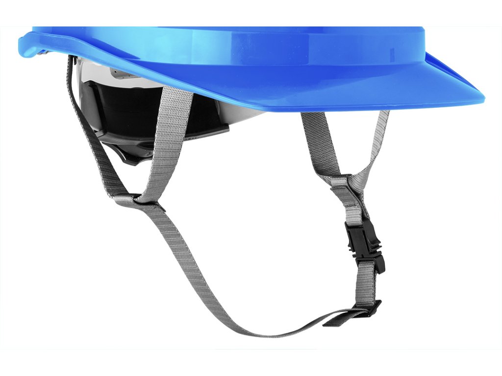 Priemyselná prilba s remienkom pod bradou, modrá, nastaviteľný obvod 52-64 cm, materiál: ABS, 6-bodový bezpečnostný pás, 4-bodový remienok pod bradou, chráni pred nárazom predmetov, ako sú kamene, dlaždice, tehly a iné podobné predmety, možno ju používať v teplotnom rozsahu -30 °C/+50 °C, automatické nastavenie obvodu pomocou gombíka, má vetracie otvory, súčasťou je potný pásik, certifikát CE