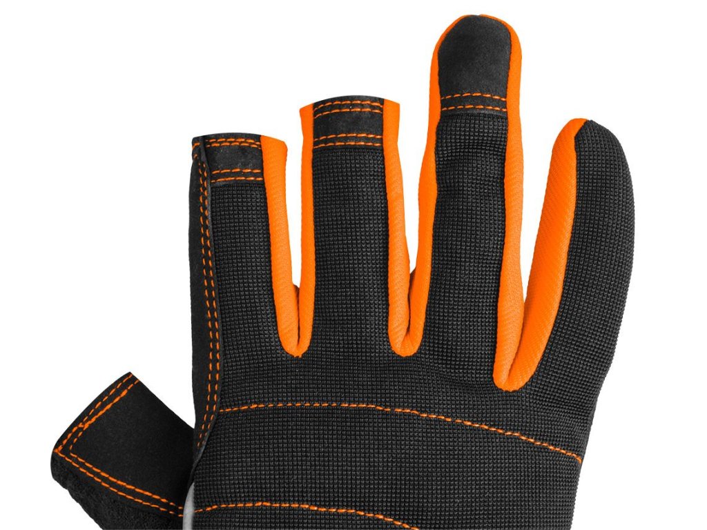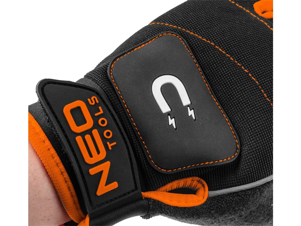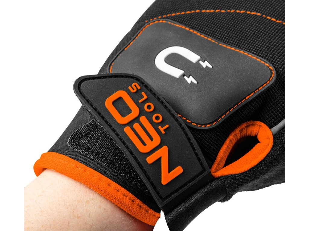 Magnetické rukavice veľkosti 10". Tri odkryté končeky prstov. Suchý zips pre nastavenie rukavice. Dlaň s protišmykovým úchopom.