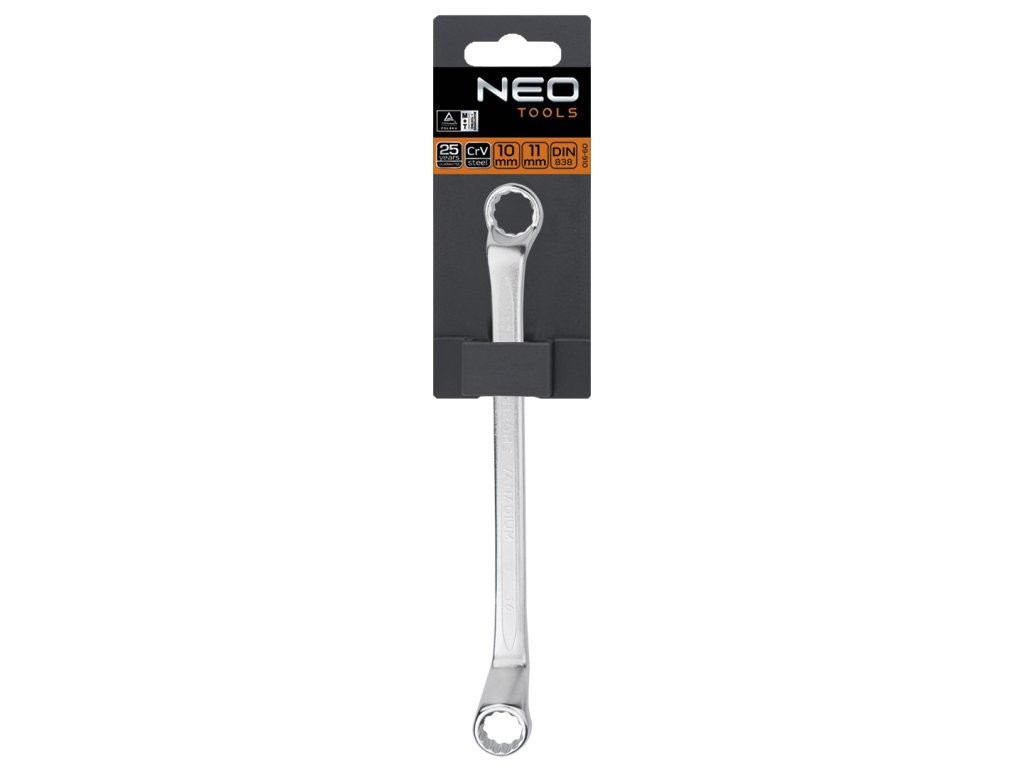 NEO ohnutý krúžkový kľúč (ref. 09-906) 6 x 7 mm, vyrobený podľa DIN 838. Vysokokvalitná chróm-vanádiová oceľ zaručuje dlhodobú životnosť kľúča. Očko posunuté o 45° uľahčuje prácu na ťažko prístupných miestach. Kvalita náradia potvrdená certifikátom TÜV a 25-ročnou zárukou výrobcu. Značka NEO spĺňa očakávania profesionálov.