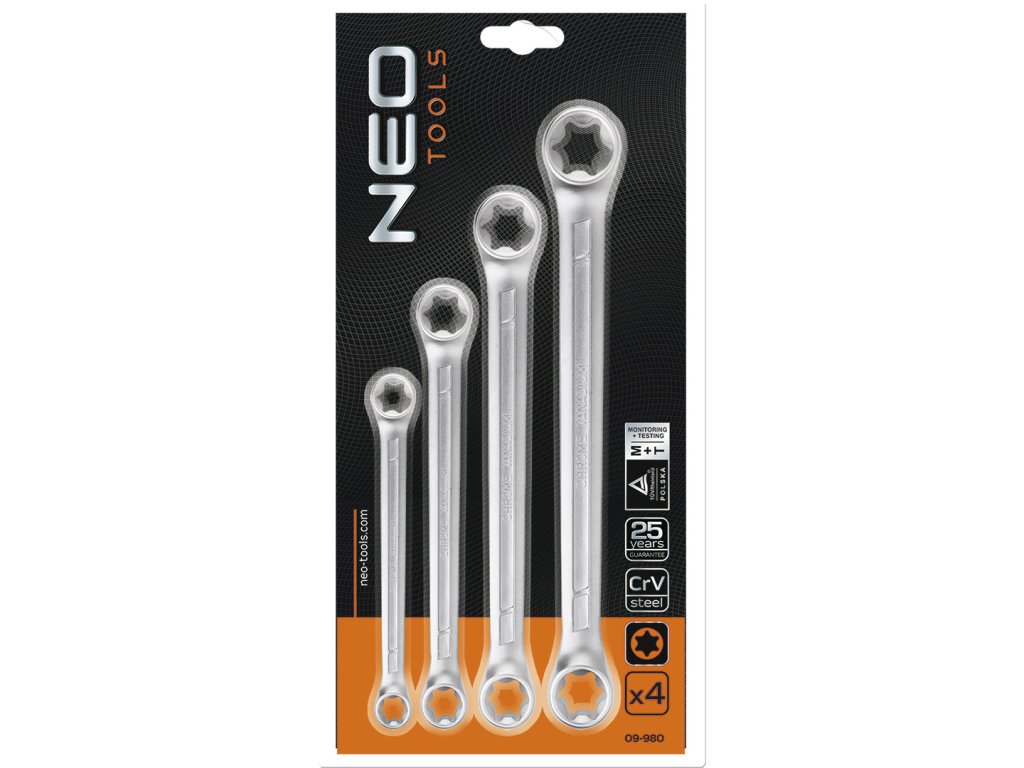 Sada krúžkových kľúčov NEO Torx (ref. 09-980) obsahuje 4 kľúče v obľúbených veľkostiach (od T6 do T24). Vysokokvalitná chróm-vanádiová oceľ zaručuje dlhodobú životnosť kľúčov. Kvalitu nástroja potvrdzuje certifikát TÜV a 25-ročná záruka výrobcu. Značka NEO spĺňa očakávania profesionálov.