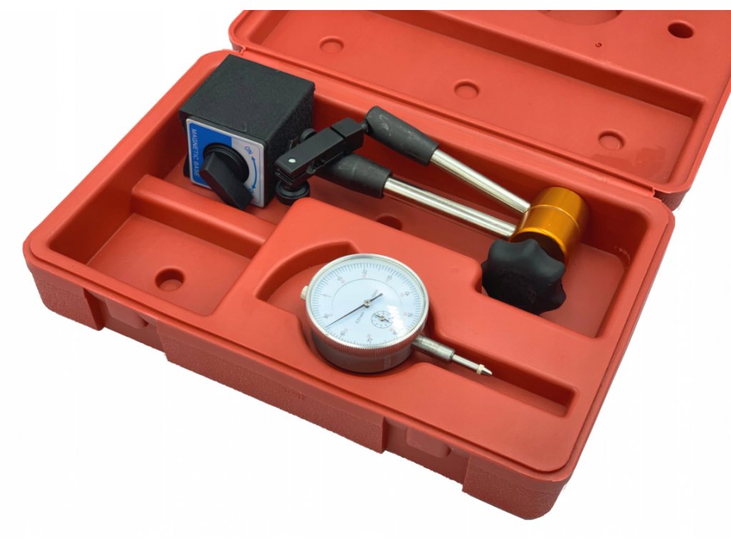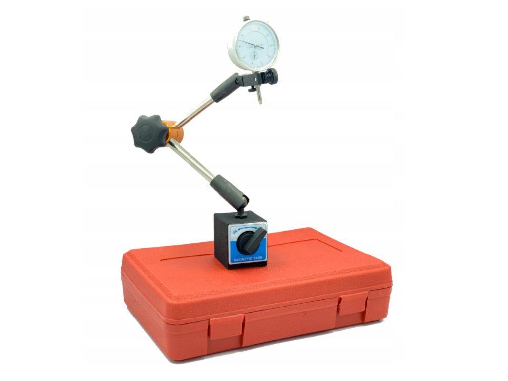 Sada na meranie odchýlok a kontrolu centrovania diskov s číselníkom. Statív s magnetickou základňou umožňuje lepšie nasadenie a väčšiu presnosť. Kontaktný bod zistí najmenšiu odchýlku zaznamenanú na číselníku.