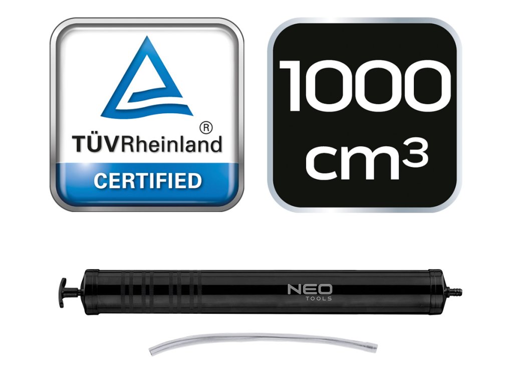 Odsávačka oleja 1000 ml NEO (ref. 11-511) sa používa na odsávanie oleja alebo iného maziva z neprístupných miest, ako sú prevodovky, hnacie mostíky. Môže sa používať v každej profesionálnej dielni. Vysoká kvalita výroby zaručuje dlhoročnú životnosť. Značka NEO spĺňa očakávania profesionálov.