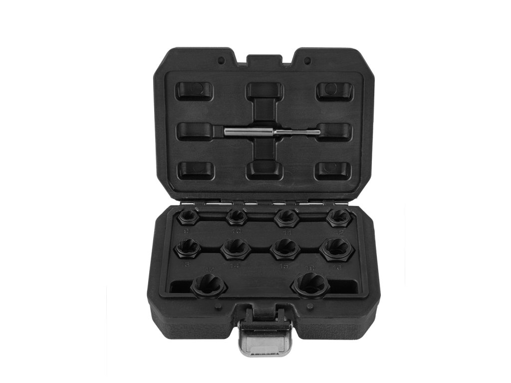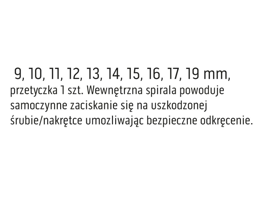 Zásuvky, na poškodené matice. Zahrnuté: 9, 10, 11, 12, 13, 14, 15, 16, 17, 19 mm, 1 ks závlačky. Vnútorná špirála automaticky uchopí poškodenú skrutku/maticu a umožní jej bezpečné odskrutkovanie.