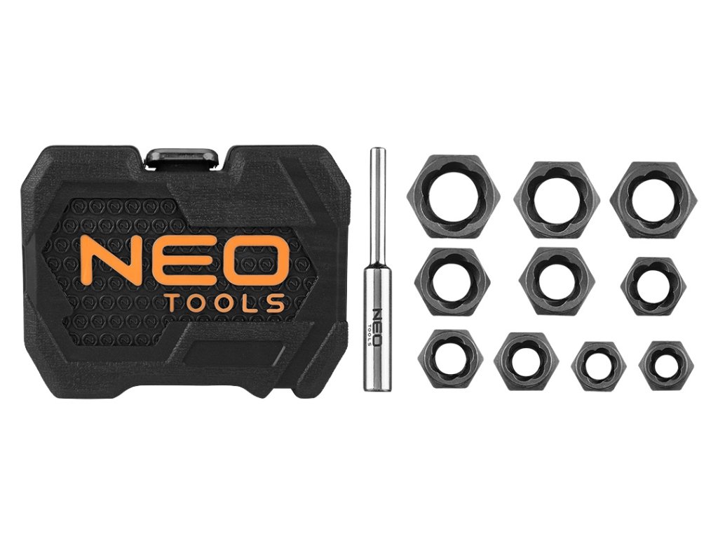 Nástrčné hlavice na lomené matice, krátke - sada 11 kusov. Súprava NEO určená na odskrutkovanie poškodených matíc, ktoré sa nedajú odskrutkovať bežným kľúčom. Vnútorná špirála sa automaticky upne na poškodenú skrutku alebo maticu a umožní bezpečné odskrutkovanie prvku. Sada obsahuje dierovač na vyberanie matíc z nástrčky. Sada je balená v kufríku.