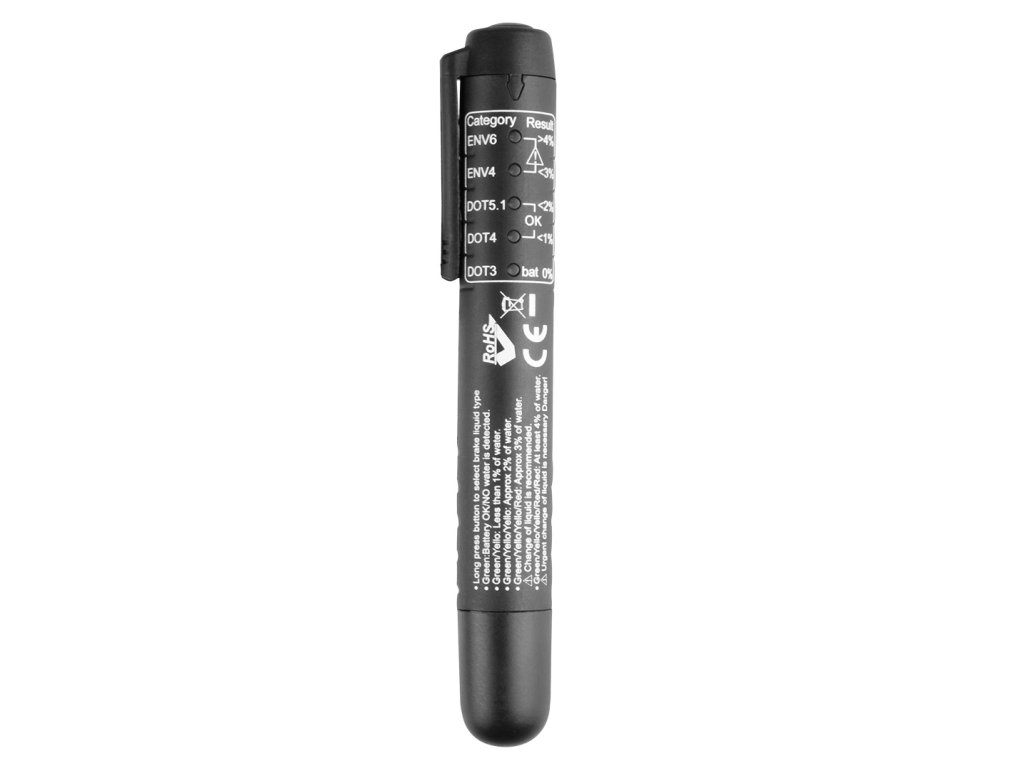 LED tester brzdovej kvapaliny 11-269 od spoločnosti NEO TOOLS je zariadenie na analýzu obsahu vody v brzdovej kvapaline s 5 LED indikátormi. Používa sa na testovanie brzdových kvapalín: DOT3, DOT4, DOT5.1, ENV6 a ENV4, čo prispieva k jeho univerzálnosti. Umožňuje testovať množstvo vody v kvapaline, čím sa minimalizuje riziko poruchy brzdového systému. Tester brzdovej kvapaliny NEO TOOLS sa ľahko používa a skladuje. Funguje na základe ľahko dostupnej a univerzálnej batérie AAA (batéria je súčasťou dodávky). Bude nepostrádateľný vo výbave každého mechanika a automobilového nadšenca.