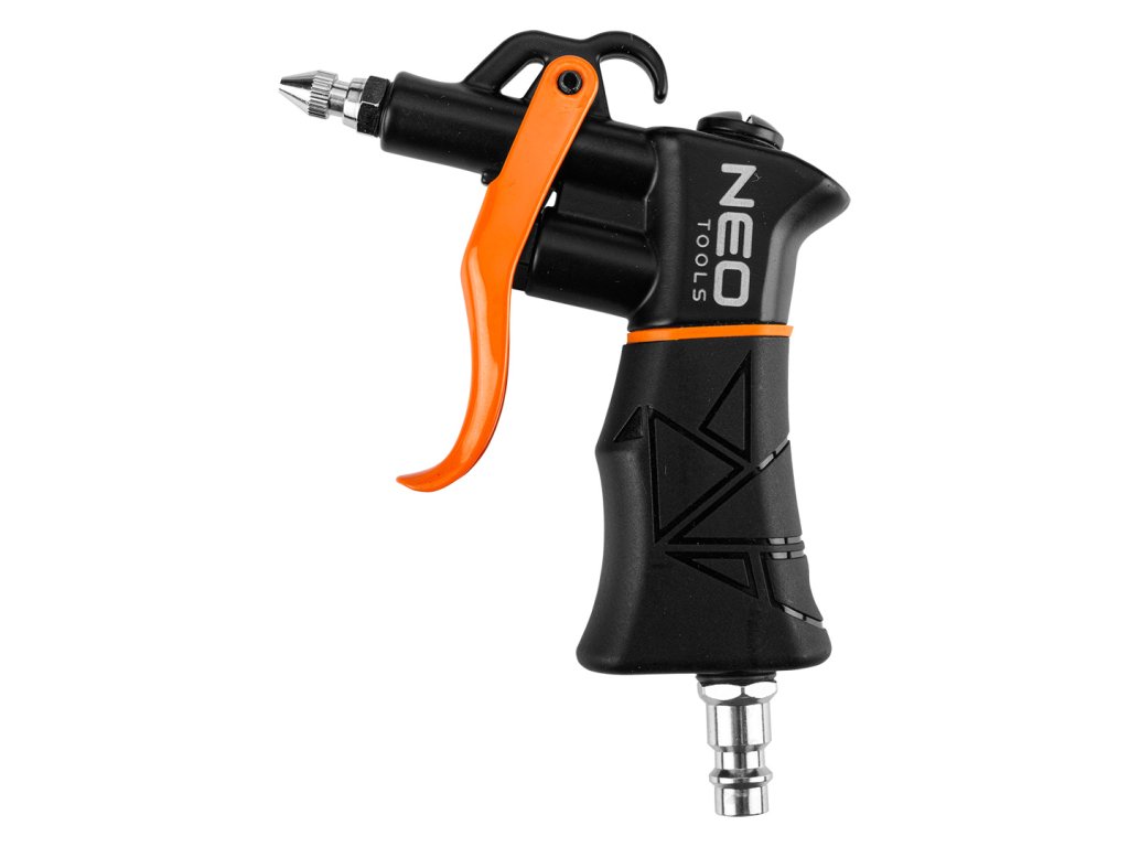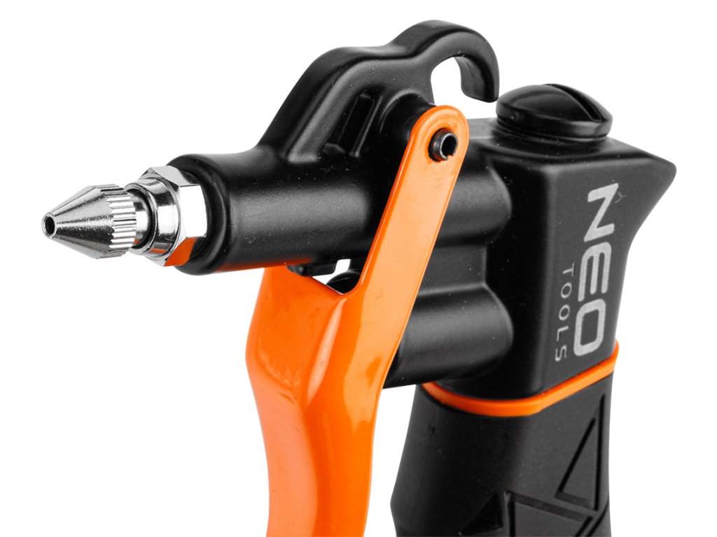Vysokoprietoková Venturiho pištoľ NEO TOOLS 14-725 je súprava 6 komponentov - robustná pištoľ, Venturiho dýza, dve predĺžené koncovky (85 a 115 mm) zakončené gumovou krytkou, kovanie a kľúč na výmenu koncoviek pištole. Pištoľ má kovovú konštrukciu a pogumovanú rukoväť. Venturiho dýza sa vyznačuje špeciálnou konštrukciou a vysokým výkonom fúkania pri nízkom tlaku vzduchu. Tento typ trysky má 4-násobne vyššiu kapacitu ako štandardné modely. Pištoľ NEO TOOLS bude preto ideálna na ofukovanie väčších plôch, čistenie prachu a iných nečistôt a sušenie. Dobre poslúži profesionálom aj domácim majstrom.