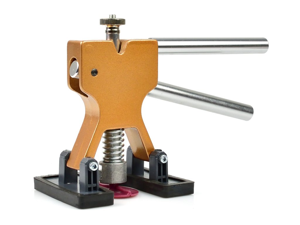 - Sťahovák nasaďte na karosériu auta tak, aby zachytil vyčnievajúcu časť adaptéra/hríbiku. Utiahnite skrutku sťahováka a potom pomaly utiahnite rukoväť, aby ste vytiahli priehlbinu.