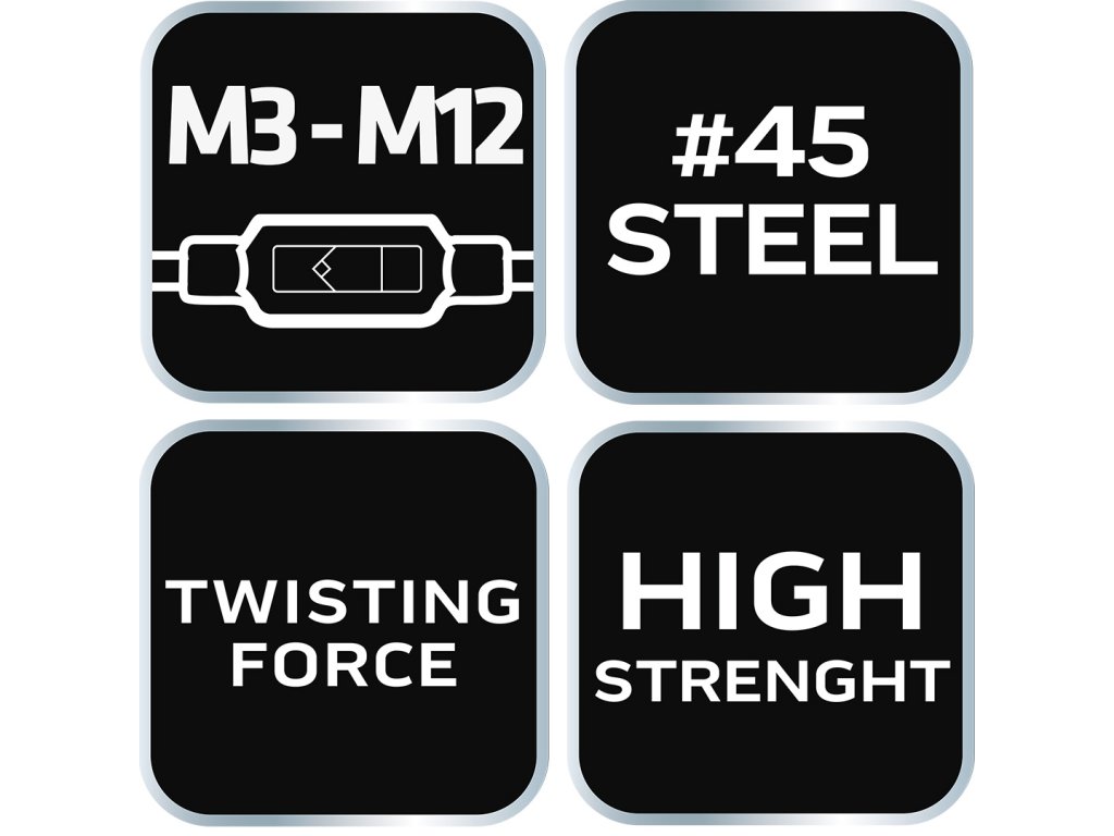 Držiak závitníkov M3-M12, oceľ 12-910 NEO je nástroj určený na prácu so závitníkmi. Je kompatibilný s prvkami veľkosti M3 až M12 NEO. Univerzálny držiak šetrí miesto a čas pri hľadaní výrobku s rovnakým účelom, ale rôznymi parametrami. Je vyrobený z ocele 45#, takže sa nedeformuje a poskytuje pevnú oporu. Kľučka značky NEO sa odporúča na použitie v dielni, pri práci mechanikov a zámočníkov.