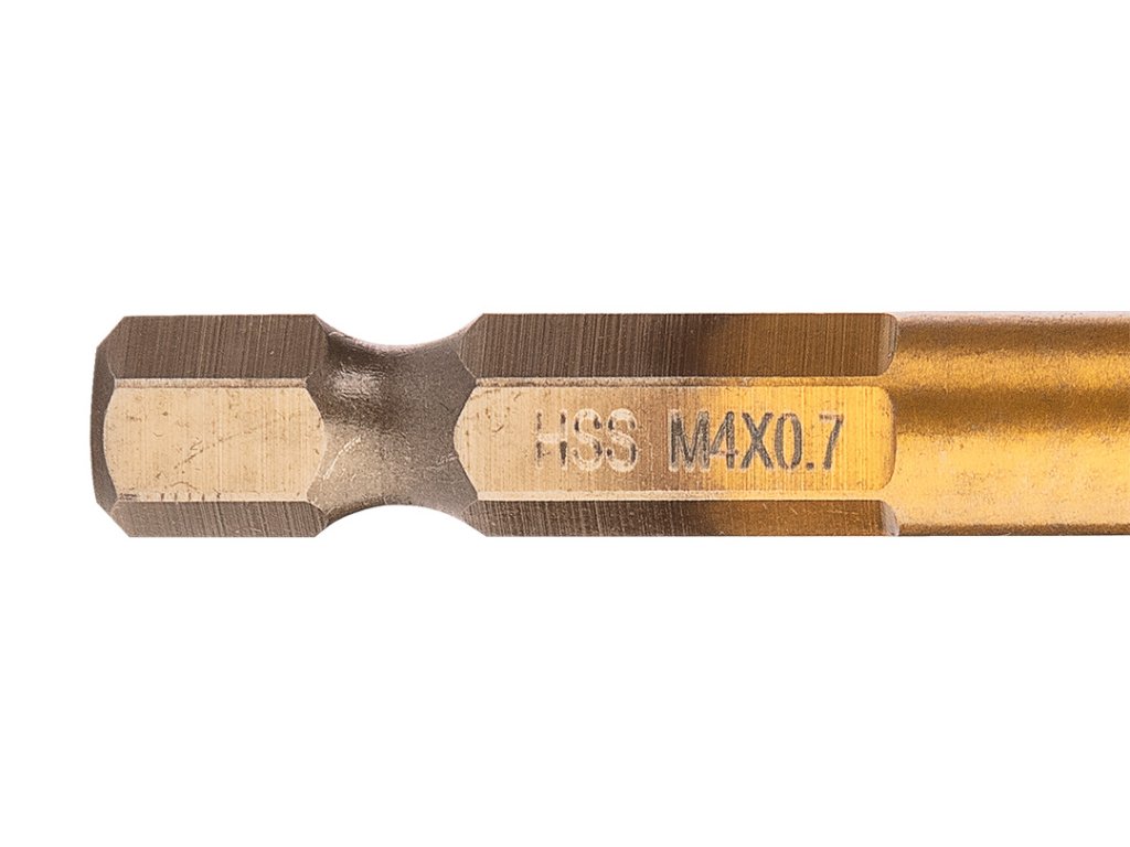 Závitový vrták, materiál: HSS, TiN povlak, typ závitu M4x0,7 mm, stopka 1/4 Hex, maximálne otáčky 1000 ot/min, priemer vrtáka 3,3 mm, celková dĺžka 65 mm, dĺžka závitovej časti 10 mm