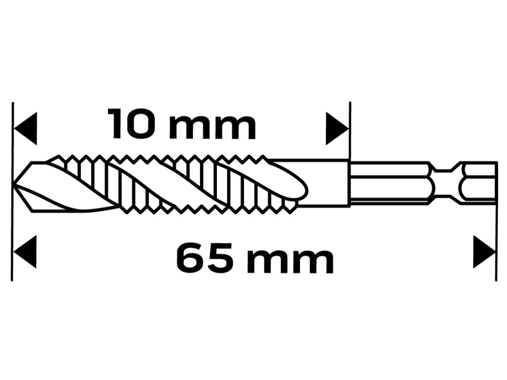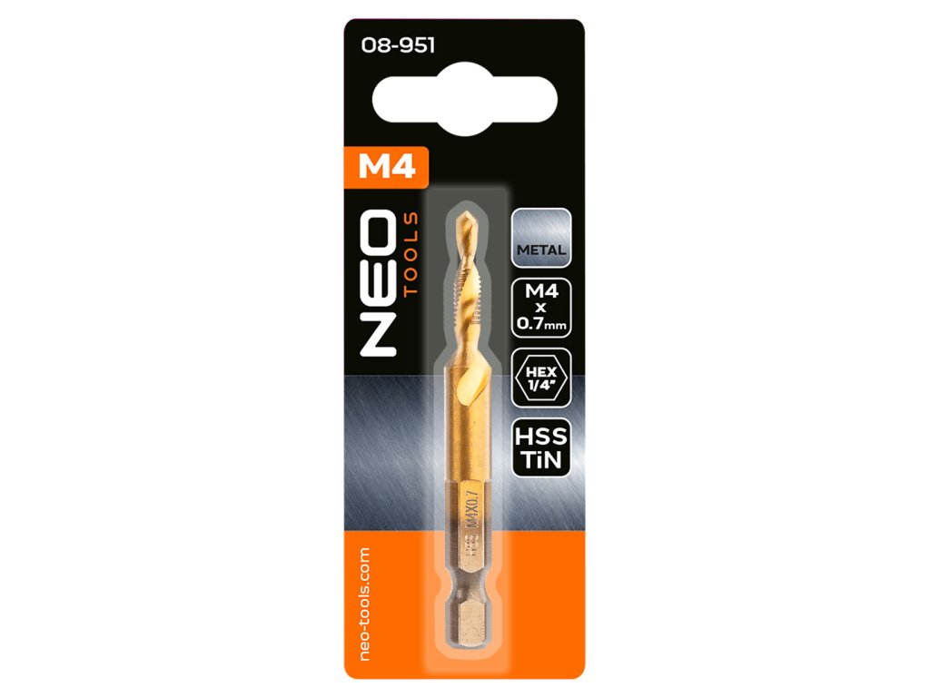 HSS TiN závitový vrták, M4 x 0,7 mm, Hex 08-951 od NEO TOOLS je vrták vyrobený z robustnej rýchloreznej ocele HSS, dodatočne potiahnutý TiN. Vyznačuje sa typom závitu M4 x 0,7 mm a skľučovadlom ? Hex. Dosahuje maximálnu rýchlosť 1 000 otáčok za minútu. Priemer vrtáka je 3,3 mm, jeho celková dĺžka je 65 mm a dĺžka závitovej časti je 10 mm. Vrták NEO TOOLS sa odporúča predovšetkým na vŕtanie a rezanie závitov do kovu. Je schopný vykonávať tieto dve funkcie súčasne, čím šetrí čas používateľa a dosahuje lepšie účinky pri práci. Odporúčané chladenie počas vŕtania.