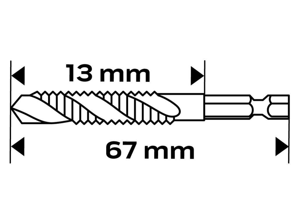Závitový vrták, materiál: HSS, TiN povlak, typ závitu M5x0,8 mm, stopka 1/4 Hex, maximálne otáčky 1000 ot/min, priemer vrtáka 4,2 mm, celková dĺžka 67 mm, dĺžka závitovej časti 13 mm