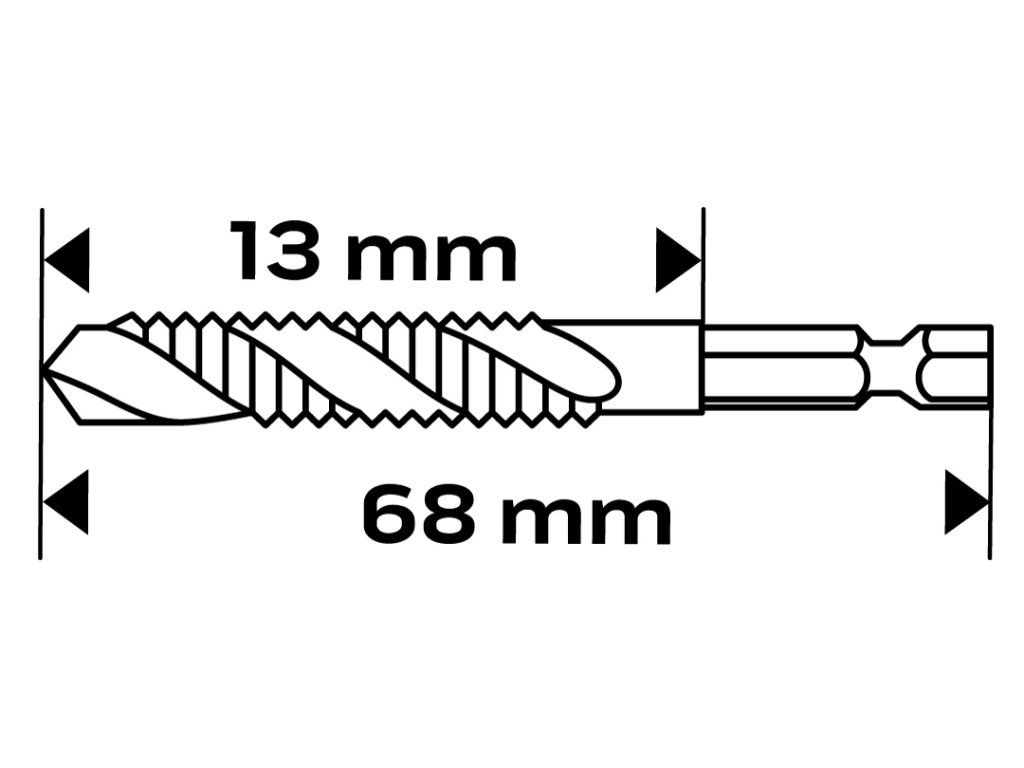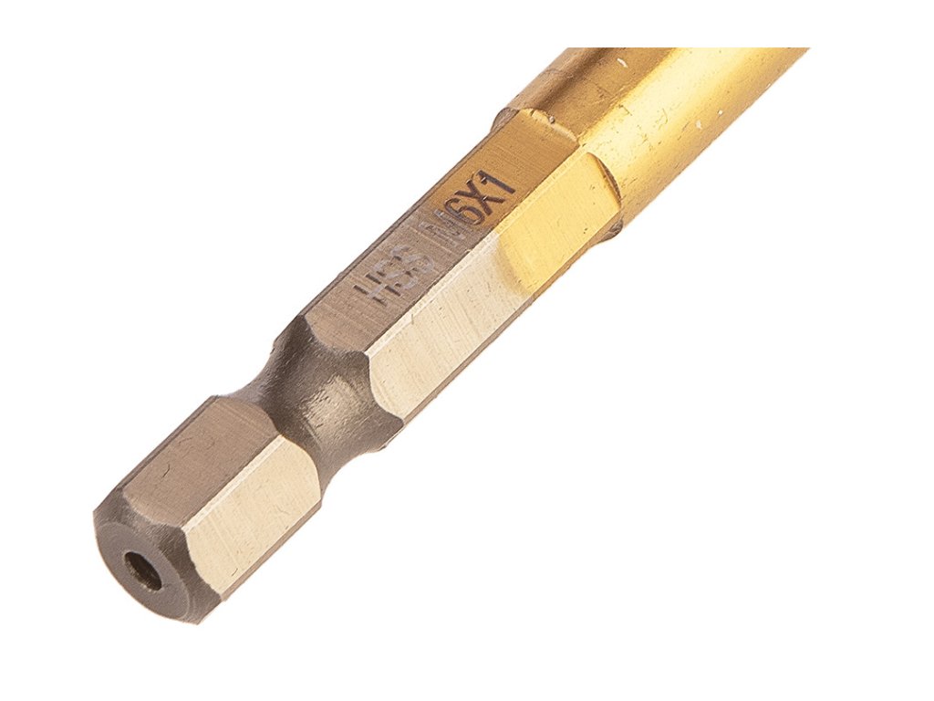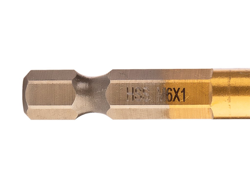 Závitový vrták, materiál: HSS, TiN povlak, typ závitu M6x1 mm, stopka 1/4 Hex, maximálne otáčky 1000 ot/min, priemer vrtáka 5mm, celková dĺžka 68mm, dĺžka závitovej časti 13mm