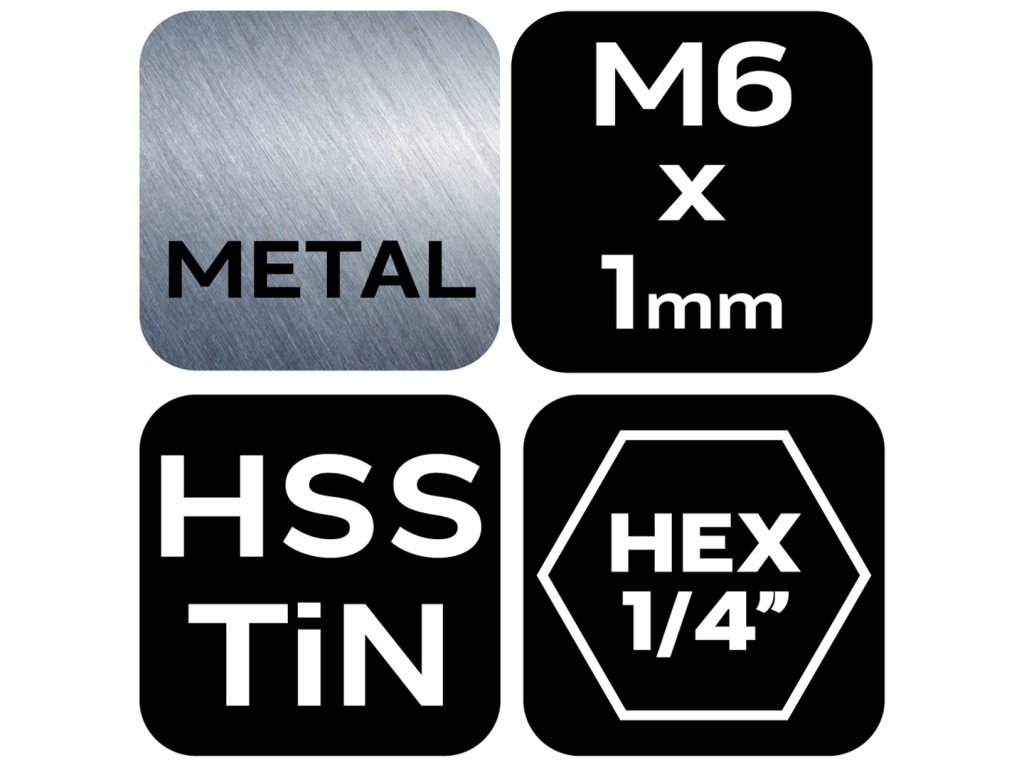 HSS TiN závitový vrták, M6 x 1 mm, Hex 08-953 od NEO TOOLS je vrták vyrobený z robustnej rýchloreznej ocele HSS, navyše potiahnutý TiN. Vyznačuje sa typom závitu M6 x 1 mm a skľučovadlom ? Hex. Dosahuje maximálne otáčky 1000 otáčok za minútu. Priemer vrtáka je 5 mm, jeho celková dĺžka je 68 mm a dĺžka závitovej časti je 13 mm. Vrták NEO TOOLS sa odporúča predovšetkým na vŕtanie a rezanie závitov do kovu. Je schopný vykonávať tieto dve funkcie súčasne, čím šetrí čas používateľa a dosahuje lepšie účinky pri práci. Odporúčané chladenie počas vŕtania.