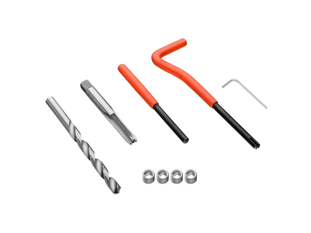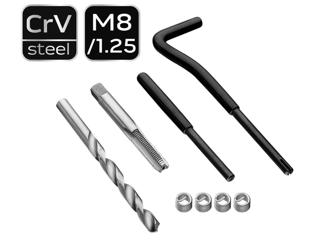 Sada na opravu závitov M8 obsahuje: opravu závitov, vŕtanie a rezanie závitov, CrV oceľ
