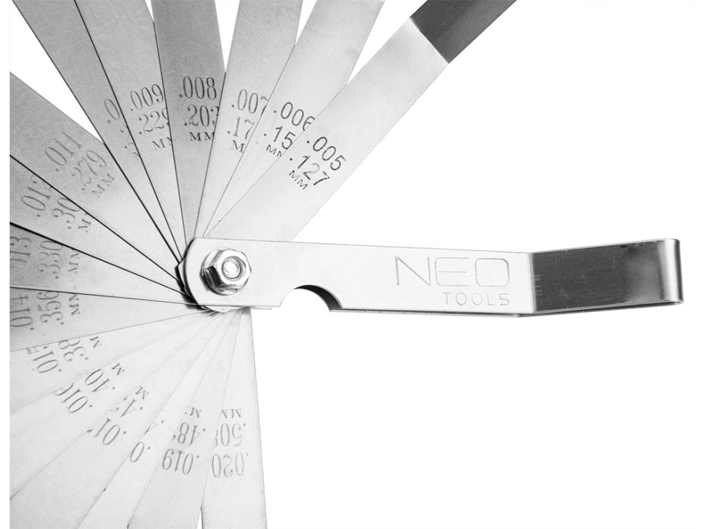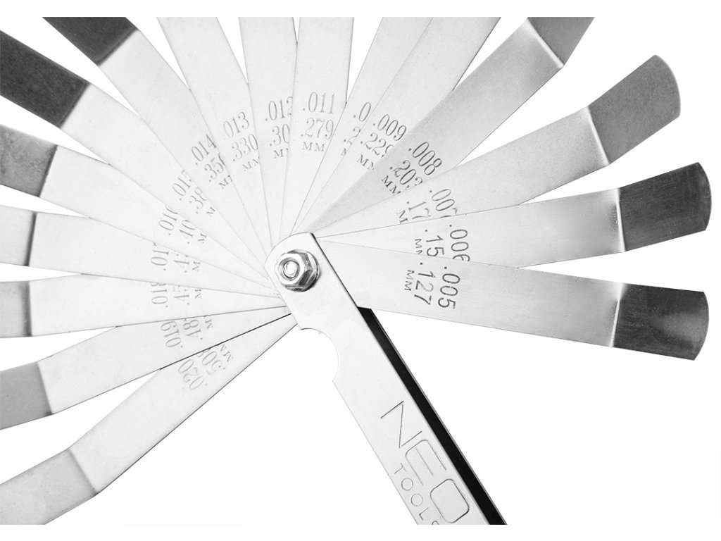 Drážkový meter 16 ohnutých listov (0,127 - 0,508 mm) 65MN/nerezová oceľ 11-192 od spoločnosti NEO je praktický nástroj, ktorý umožňuje merať vzdialenosť medzi dvoma komponentmi konštrukcie, ak nie je možné použiť iný merací prístroj. Má 16 ohnutých listov s hrúbkou od 0,127 do 0,508 mm, ktorých výsledky možno ľahko odčítať aj po odstránení nástroja z medzery - preto sa používa aj v situáciách, keď máme obmedzený priestor. Umožňuje meranie vôle ložísk alebo vôle ventilov motora. Na druhej strane môže prídelca sám skontrolovať a nastaviť medzeru na elektródach zapaľovacej sviečky kosačky alebo benzínovej reťazovej píly. Merač medzery značky NEO je vyrobený z robustnej 65 MN ocele a nehrdzavejúcej ocele. Je ideálny pre autodielne a garáže používateľov motorových vozidiel.
