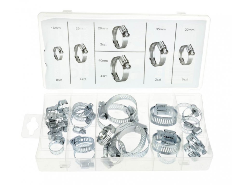 Sada kovových hadicových svoriek v 6 veľkostiach. V plastovom boxe 26 kusov.