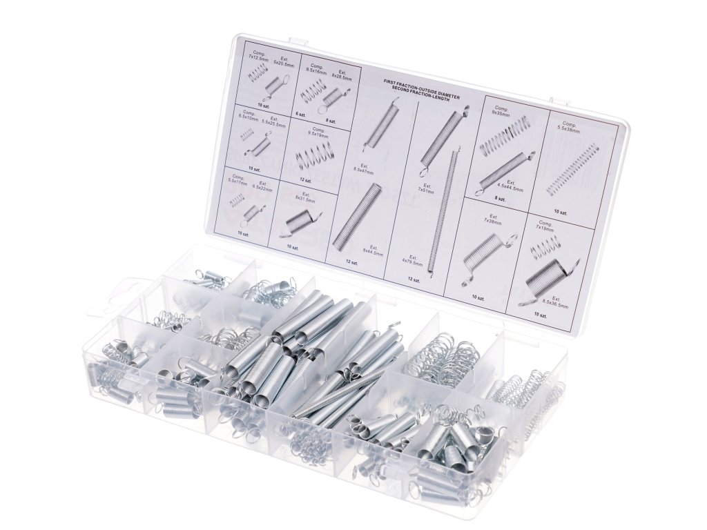 Praktická sada 200 tiahacích a rozťahovacích pružín, nenahraditeľná v automechanickej dielni, v poľnohospodárstve a priemysle. Praktický organizér umožňuje ľahký prístup k vhodnej veľkosti.