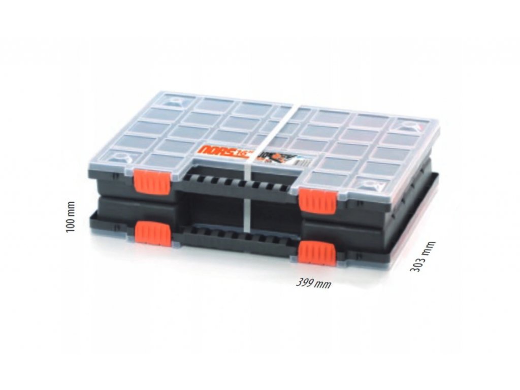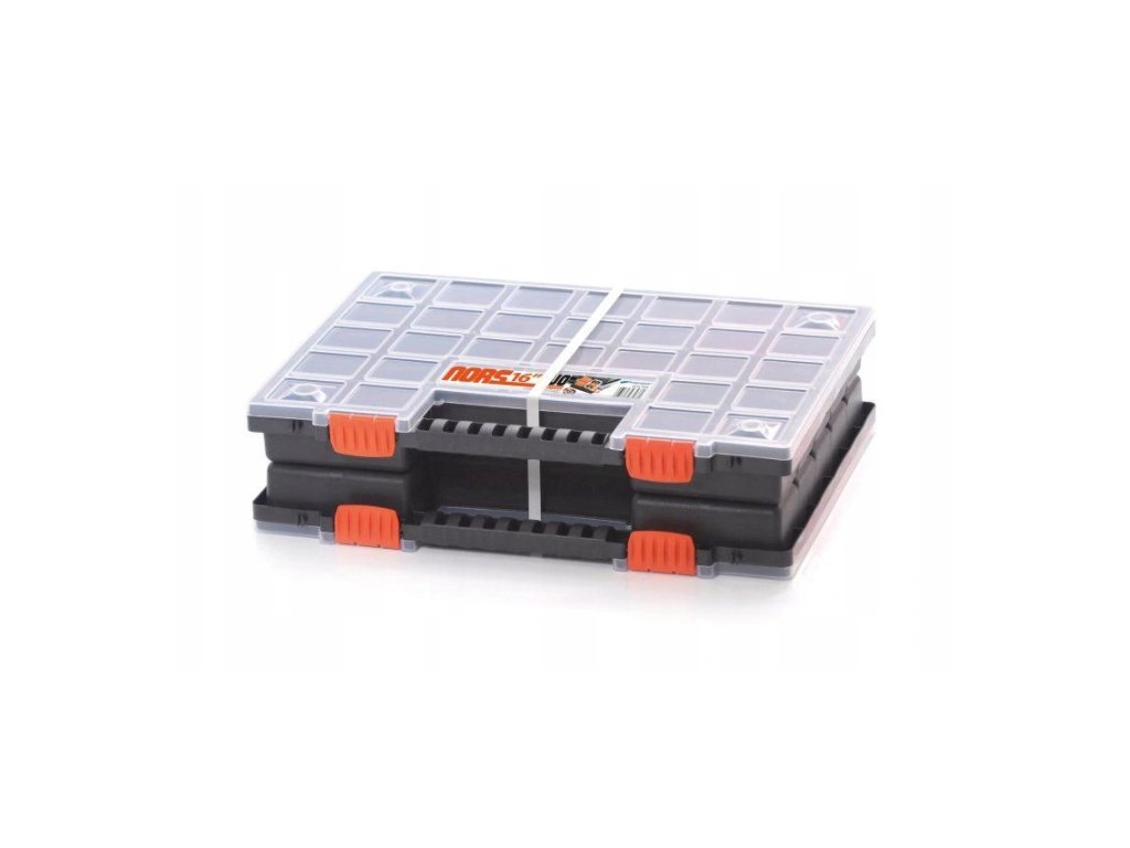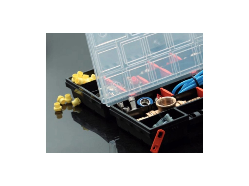 Organizér pozostávajúci z dvoch častí, ktoré je možné rozopnutím spon oddeliť a používať ako samostatné kufríky. Kufríky sú otečené k sebe priehľadným poklopom a tak poskytujú 100% ochranu pre uskladnené náradie, skrutky, matice a klince. Priehradky si zároveň môžete prispôsobiť podľa svojej potreby. Množstvo kombinácií a veľkostí priehradiek. Kufrík je vyrobený z pevných materiálov odolných voči poškodeniu.