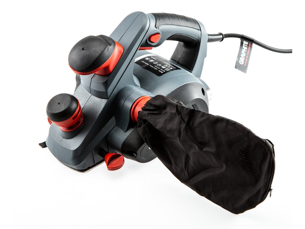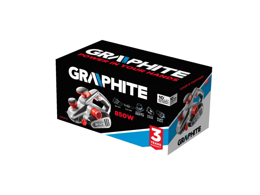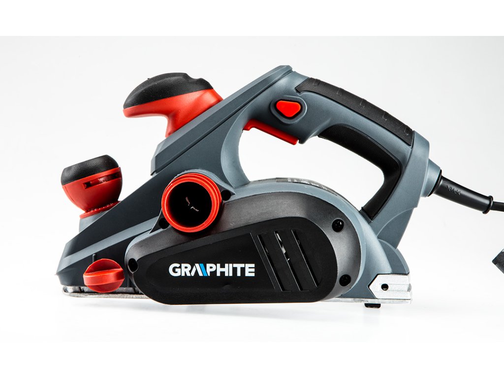 Vysoko kvalitný hoblík GRAPHITE s výkonom 850 W je určený na spracovanie dreva. Prístroj má moderný dizajn a ergonomický tvar. Hliníková stopa zariadenia nepodlieha deformáciam. Zariadenie umožňuje hobľovanie so šírkou 82 mm a hĺbkou 3 mm. Pri ponornom hobľovaní je rozsah zanorenia od 0 do 12 mm. Počas prevádzky motor zariadenia môže generovať do 16500 otáčok hlavy za minútu. Vďaka protišmykovým nástrčkám na hlavnej, prídavnej rukoväti a gombíkom pre nastavenie hĺbky rezu, sa hoblík pevne drží v rukách. Zariadenie má automatické vyhodenie „parkovacej nohy". Triesky nikdy nezostávajú pod hliníkovou nohou, pretože sú automaticky vyhodené na pravej alebo ľavej strane. Vďaka 3 drážkam v tvare písmena V, je tiež možné lemovanie. Zariadenie je vybavené pružným a odolným napájacím káblom v gumovom obale s dĺžkou 3 m, ktorý je tiež určený na profesionálne a priemyselné použitie tak v interiéri, ako aj v exteriéri. Súčasťou sady s hoblíkom sú: prachové vrecko, rovnobežné vodítko a podporu ako aj vodítko pre ponorné hobľovanie. Súlad s európskymi bezpečnostnými normami potvrdzuje certifikát CE.