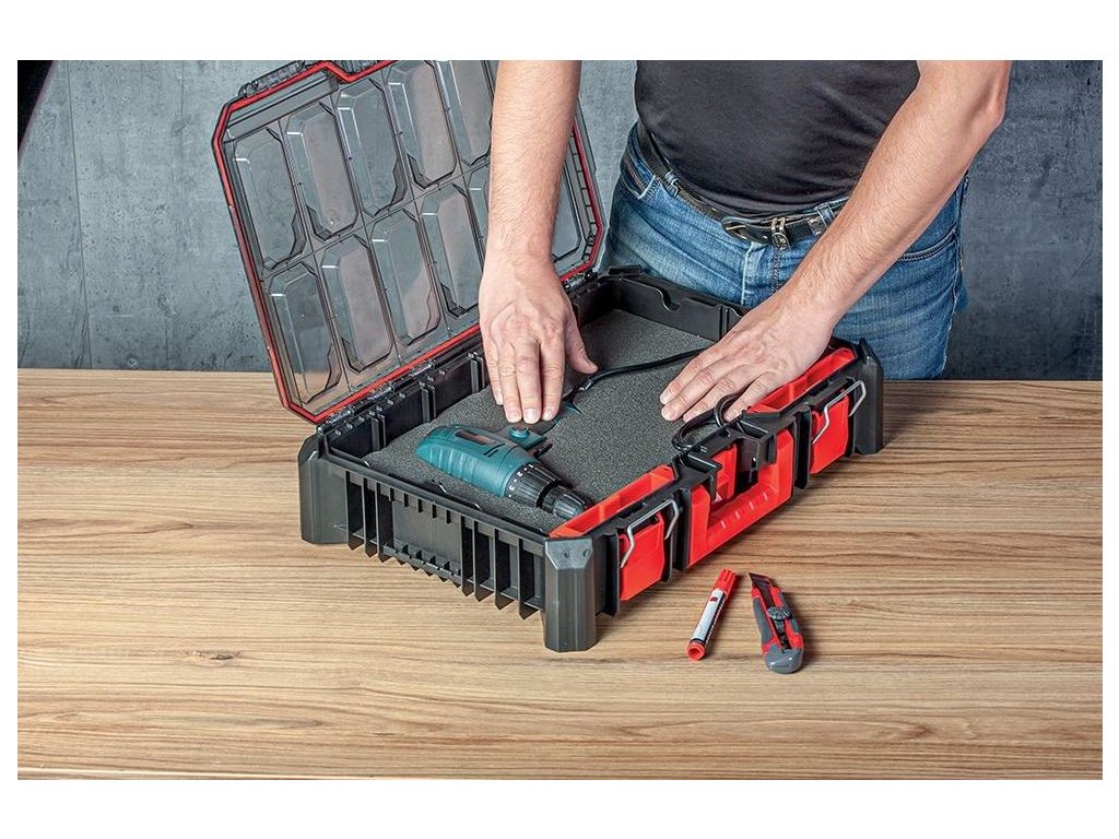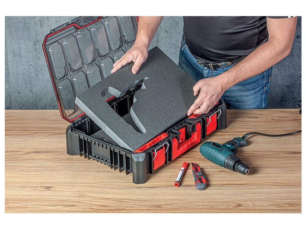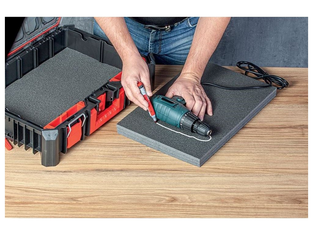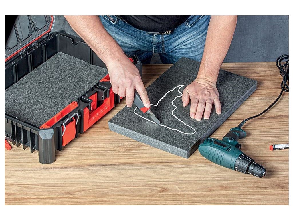 Pomocou penovej výplne si môžete usporiadať veci vo Vašom kufríku úplne jednoducho. Penovú vložku možno tvarovať pomocou orezaváka alebo ostrého nožíka podľa Vami požadovaných tvarov, resp. rozmerov. Vytvoríte si tak Vami želanú kontúru. Penové vložky umožňujú viac organizované a bezpečnejšie skladovanie Vášho náradia.