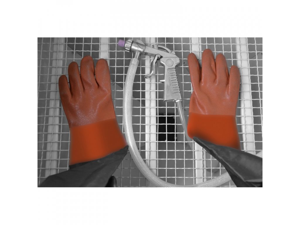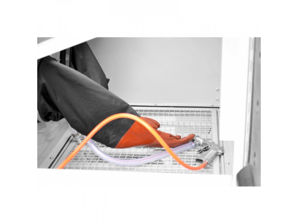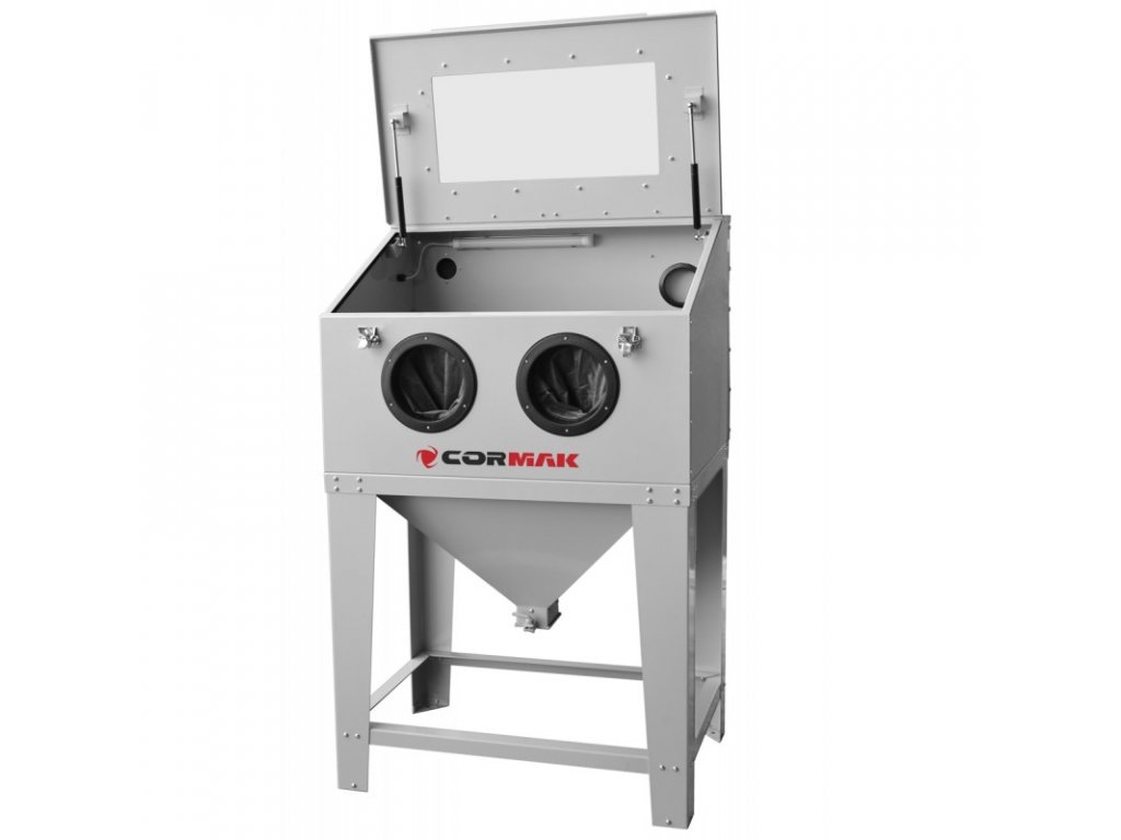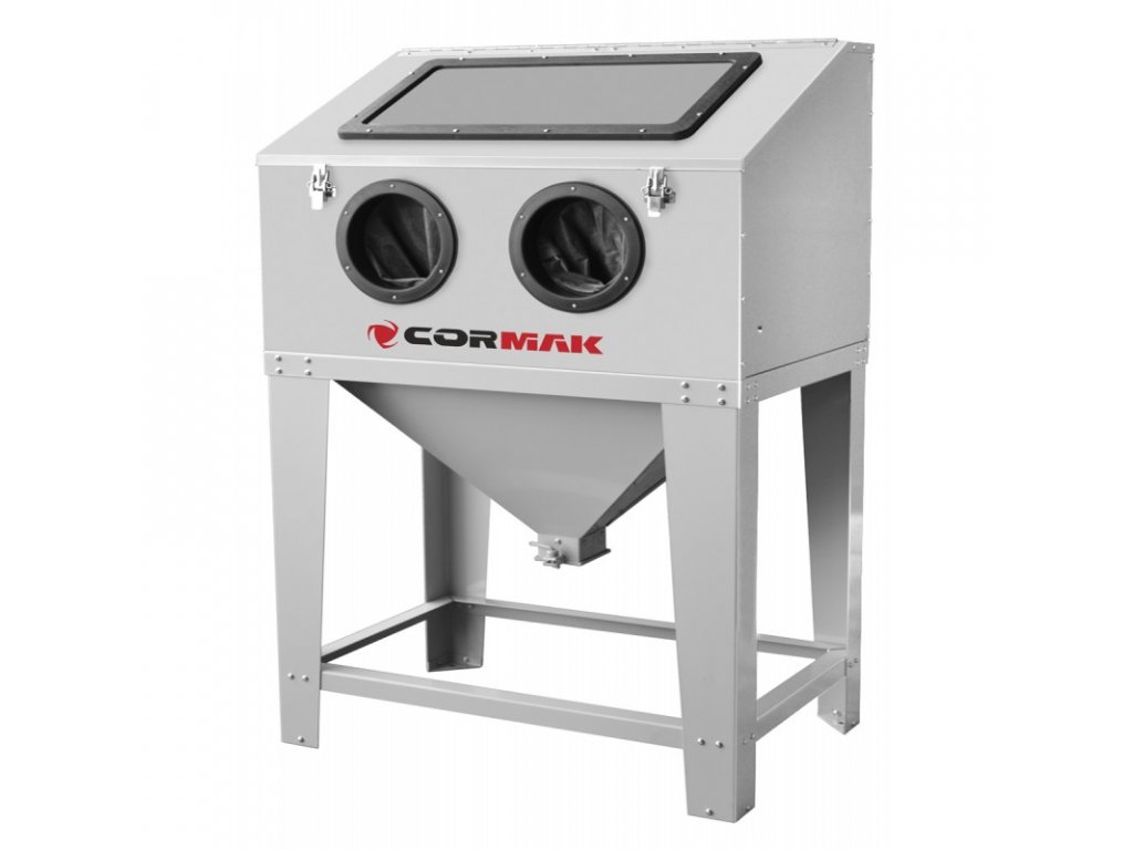 Kabínová pieskovačka je vybavená osvedčeným systémom ovládania, pevnou a priestrannou komorou s horným otváraním, pevnou pieskovacou pištoľou, štyrmi keramickými tryskami, kvalitnými pracovnými rukavicami, osvetlením pracovného priestoru, veľkým oknom (bez slepého uhla).Pieskovací box okrem kompaktného dizajnu a veľkého, priestranného pracovného priestoru zaisťuje jednoduchosť použitia, spoľahlivosť a bezpečnosť práce. Bezprašná prevádzka zariadenia je zabezpečená použitím obvodových tesnení, čo umožňuje vykonávať prácu ekologicky. Pieskovacia hadica je umiestnená v spodnej časti zbernej nádoby. Odtokový otvor umožňuje rýchlu výmenu pieskovacieho materiálu.