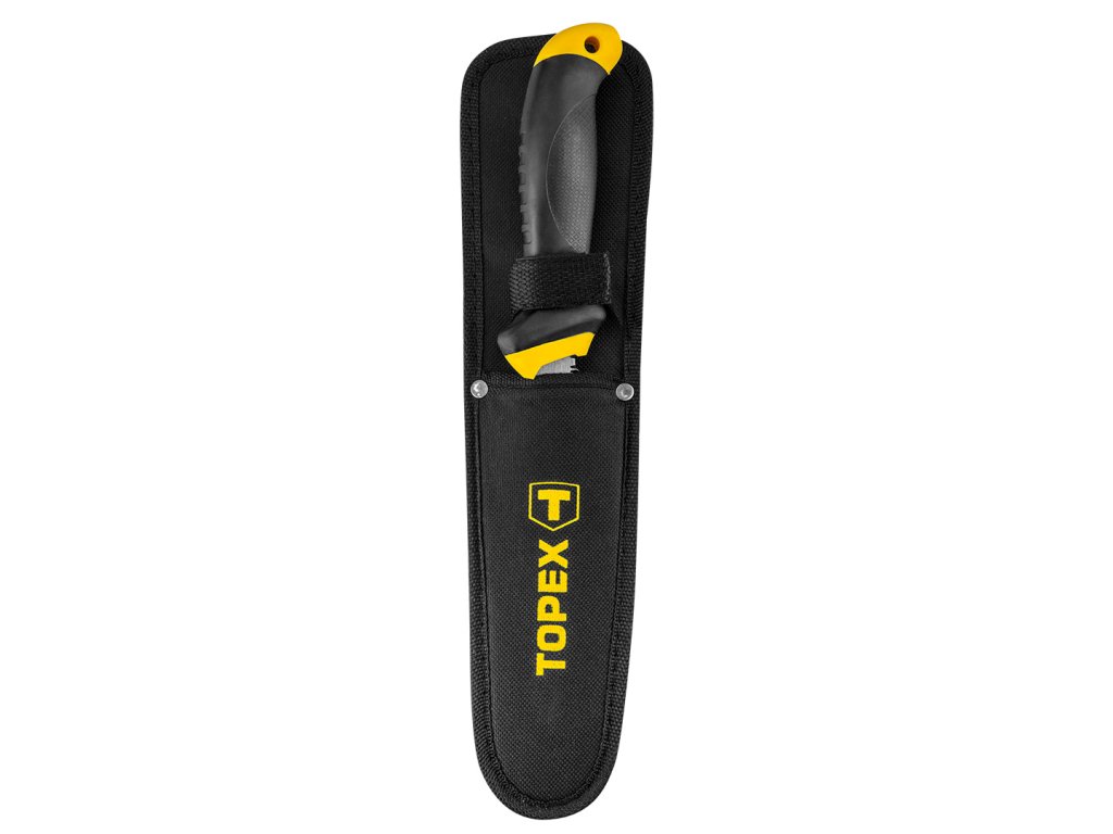 Píla na sadrokartónové dosky TOPEX (ref. č. 10A717P) s dĺžkou pílového listu 150 mm s obalom. Je určená na vypiľovanie otvorov do sadrokartónových dosiek. Pílové listy z vysokokvalitnej kalenej ocele zaručujú dlhú životnosť nástroja. Obojstranné ostrenie zubov znižuje odpor pri rezaní. Ergonomická plastová rukoväť umožňuje presné vedenie a protišmyková vrstva umožňuje lepšie uchopenie a zaručuje vysoký komfort práce. Pevný textilný obal s možnosťou upevnenia na opasok uľahčuje prepravu a skladovanie nástroja. Značka TOPEX je určená pre domácich kutilov.